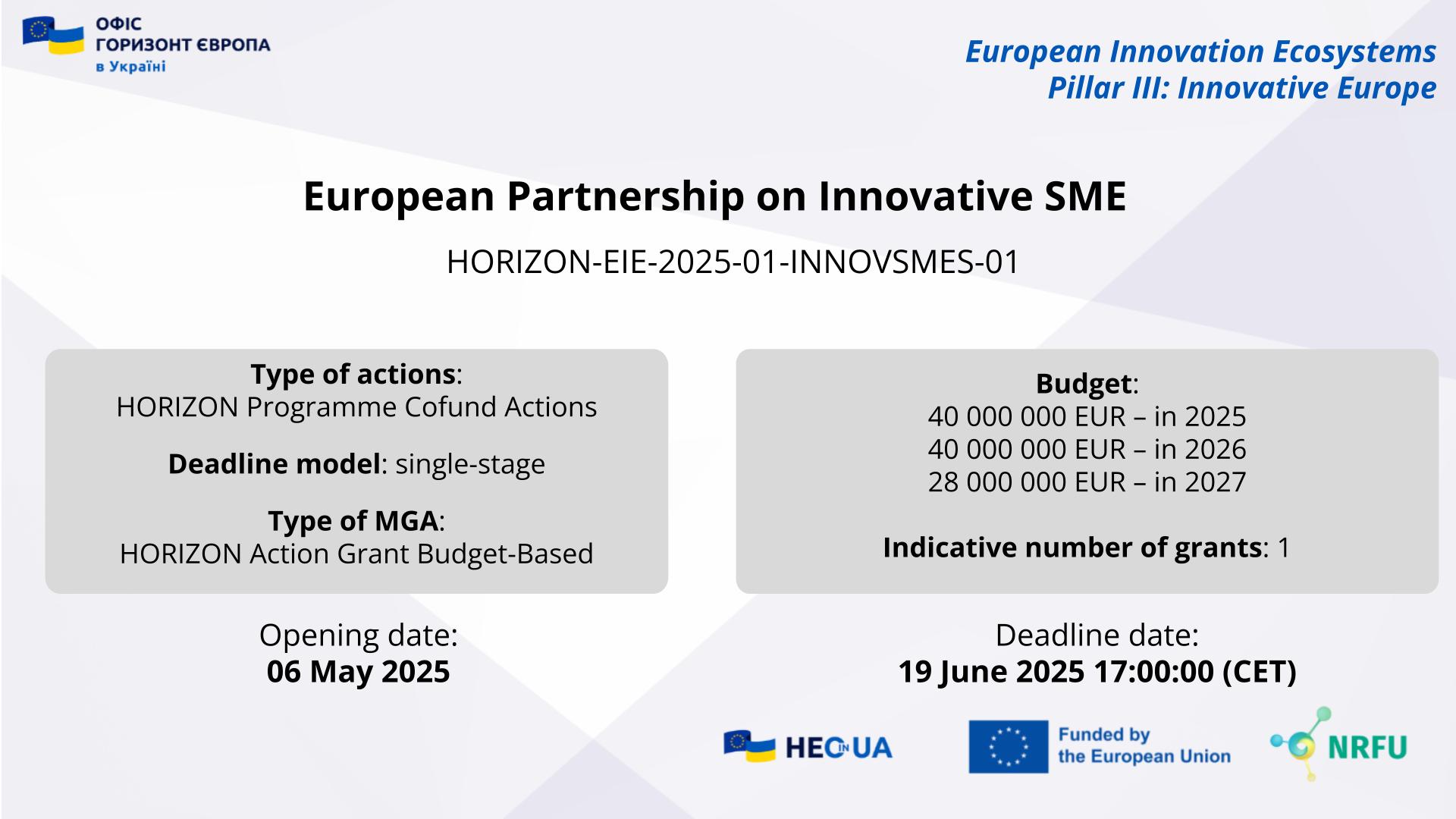 Horizon Europe Office in Ukraine, NRFU, reminds that the deadline date for submitting an application for participation in the call for the European Partnership on Innovative SME (HORIZON-EIE-2025-01-INNOVSMES-01) is June 19, 2025, 17:00:00 Brussels time. The call was announced as part of the Horizon Europe European Innovation Ecosystems of the Pillar III Innovative Europe.