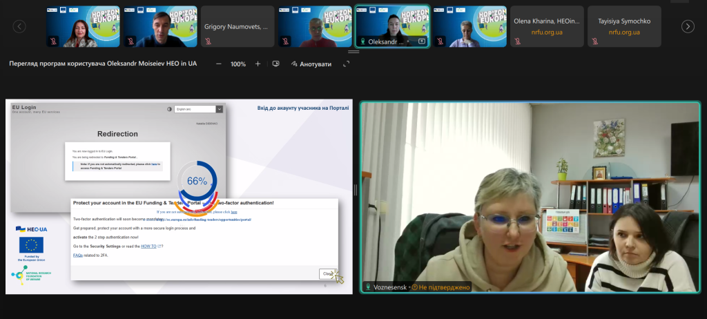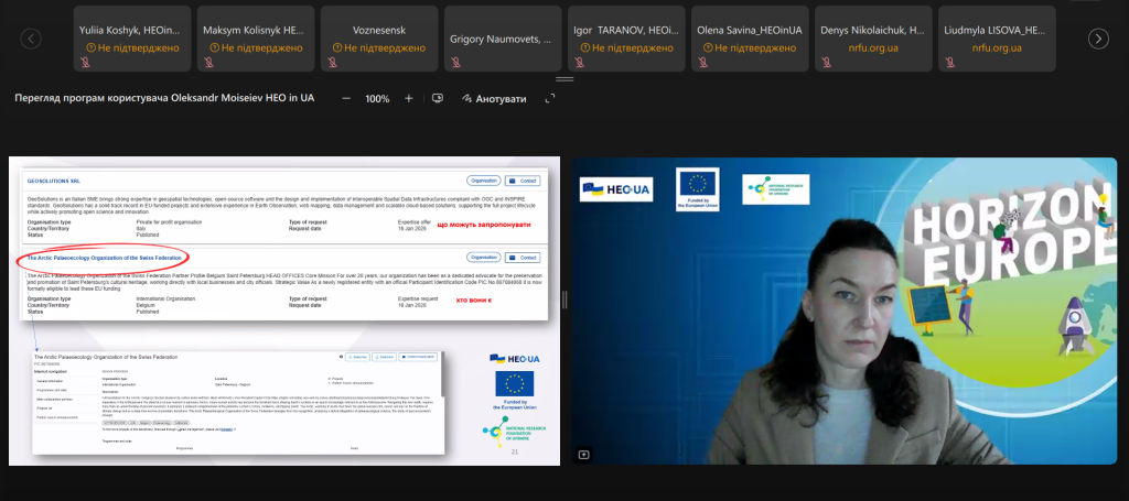 Nataliia Didenko, Deputy Head of Horizon Europe Office in Ukraine, NRFU, which, among other things, conducts master classes, where in practice it shows potential applicants how to work with the Portal, step by step told how to register an organisation and get a PIC number, announce the desire to join the consortium, choose a call, look for partners for joint writing of a project proposal and a lot of other useful information.