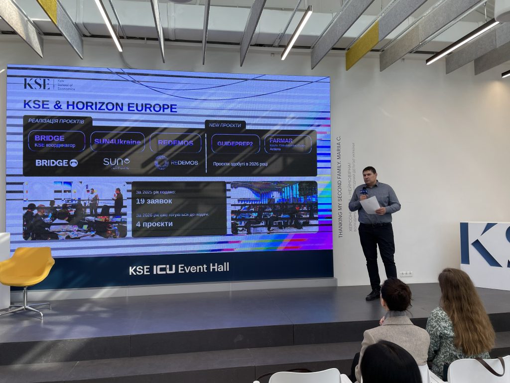It should be noted that KSE is currently participating in the implementation of several projects within the Horizon Europe Programme. These are SUN4Ukraine, REDEMOS, GUIDEPRWP2 and FARMAR (MSCA). We would like to make a special mention of the BRIDGE project, “Building Resilient Innovations in Democracy, Governance and Excellence”, as KSE is not just a participant but also its coordinator. As part of this initiative, KSE partners with European Universities – Berlin University of Technology (Germany), Erasmus University Rotterdam (Netherlands), and the University of Tartu (Estonia) – as well as the Center for Innovations Development (CID) in Ukraine. Together, they will leverage their expertise and best practices to develop and research digital democracy innovations, strengthening the impact of KSE’s research on policy-making and effective decision-making in the recovery and reconstruction of Ukraine.