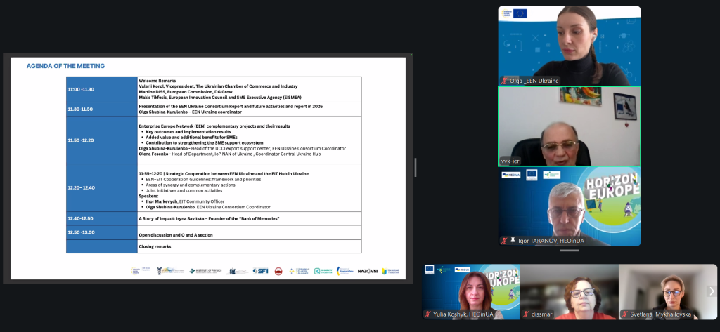 On February 27, 2026, a meeting of the Advisory Board for Ukraine, organised by the Enterprise Europe Network (EEN), was held. The objective of the meeting was to announce the results of cooperation between EEN and Ukraine, in particular between the EEN-Ukraine Consortium and EIT Hub in Ukraine. In terms of the synergy of European Union projects and funding programmes, representatives of Horizon Europe Office in Ukraine, NRFU joined the event.