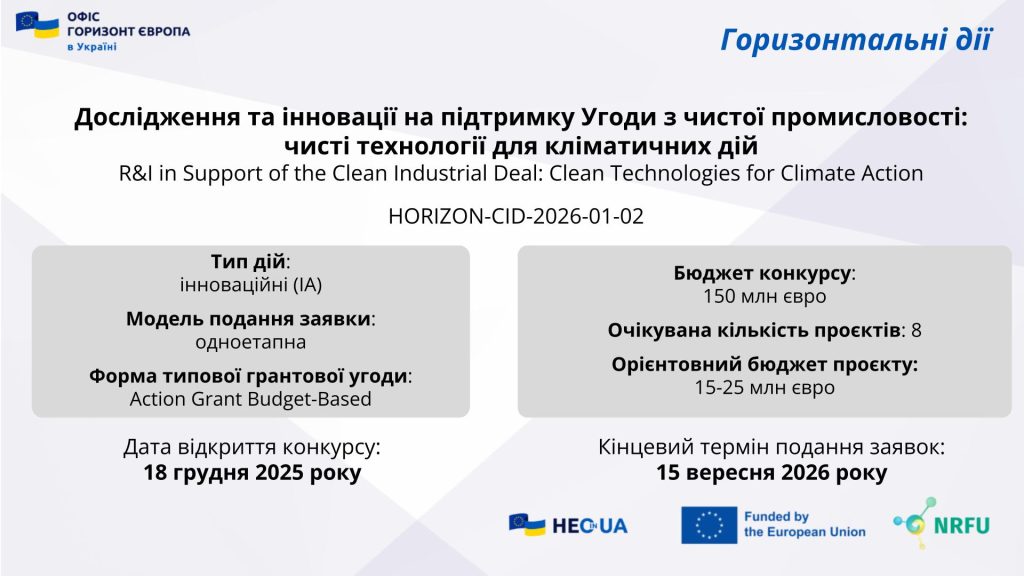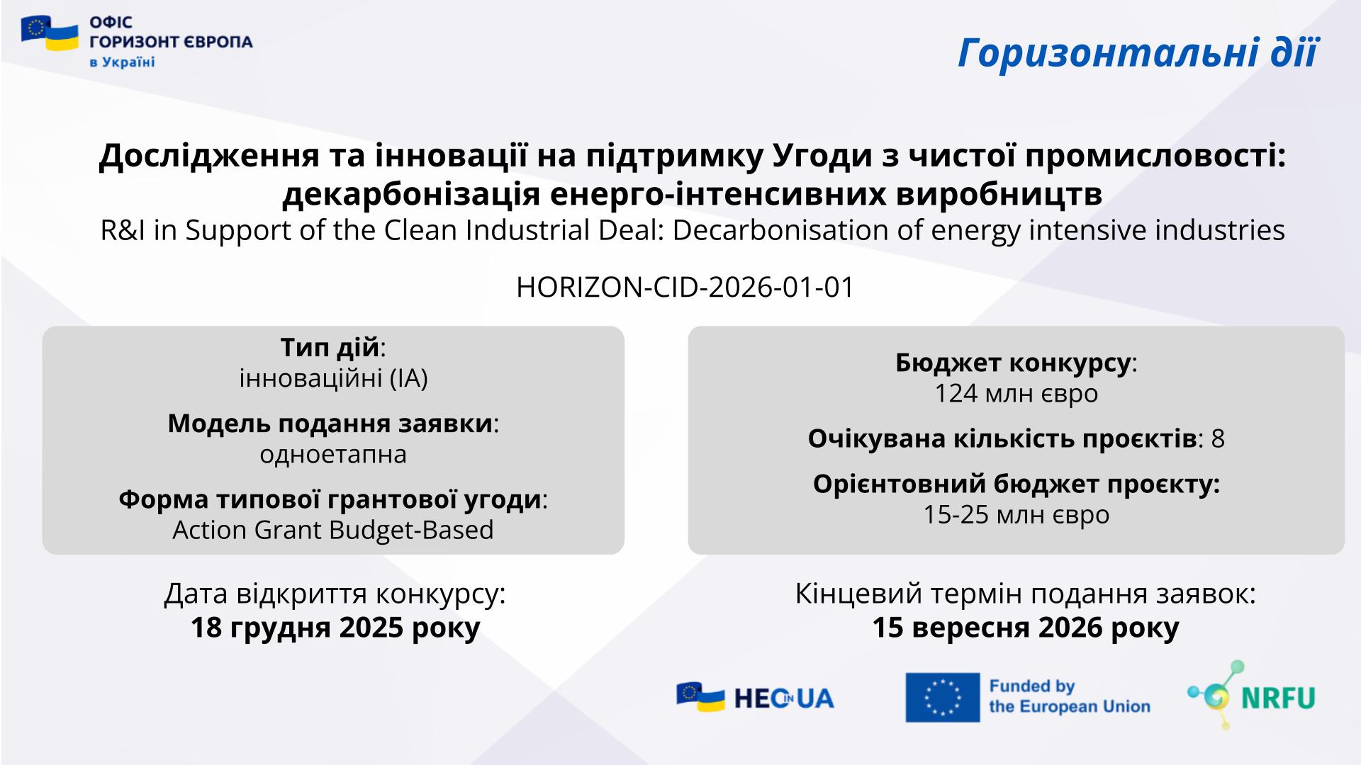 CID-2026-01 – горизонтальний конкурс «Дослідження та інновації для підтримки Угоди про чисту промисловість» розроблений для цільових дослідницьких та інноваційних проєктів з метою виконання зобов’язань ЄС у рамках Угоди про чисту промисловість. Конкурс з орієнтовним бюджетом 540 млн євро має на меті прискорене розгортання на ринку передових чистих технологій та промислових рішень з декарбонізації, орієнтованих на технологічну досконалість та готовність до доступу на ринок.