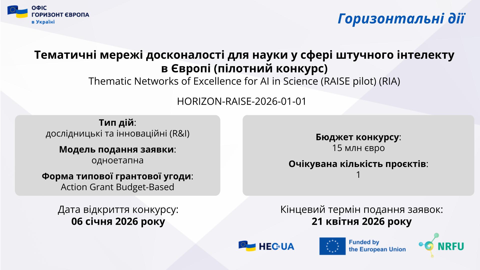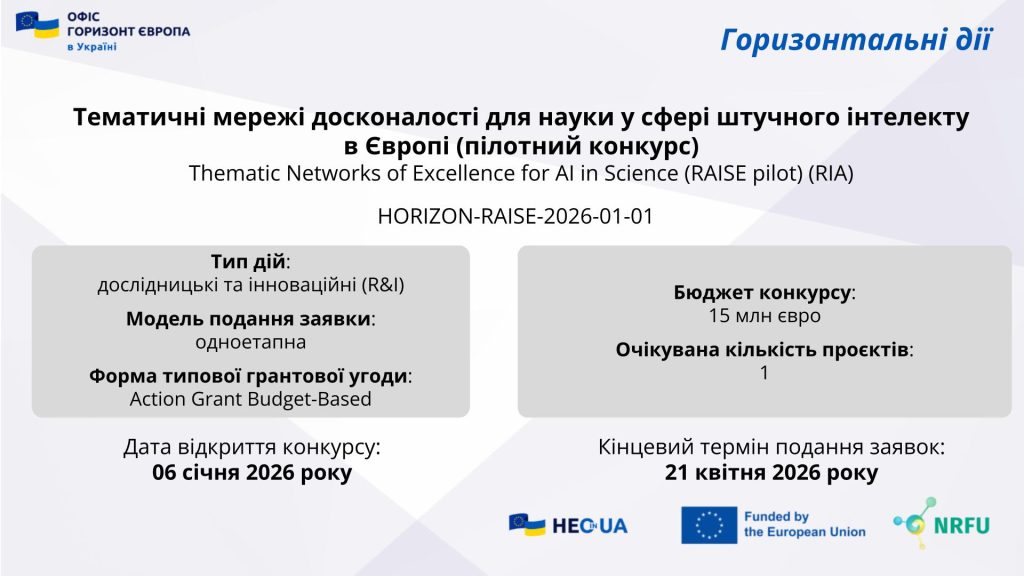 – Докторські мережі для науки у сфері штучного інтелекту (пілотний конкурс) / RAISE Doctoral Networks for AI in Science (RAISE pilot)