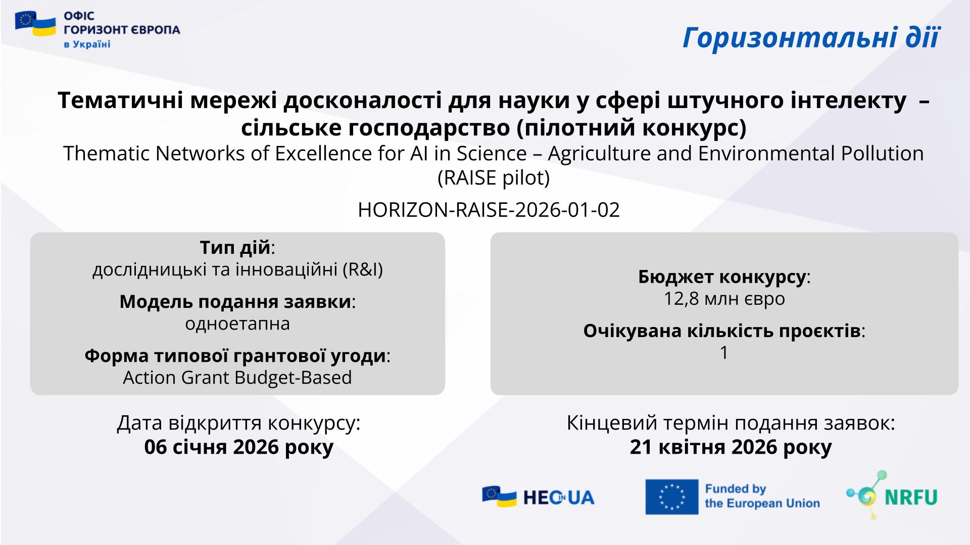 RAISE-2026-01 – горизонтальний конкурс «ШІ в науці» спрямований на сприяння розробці надійних рішень штучного інтелекту для подолання значних суспільних та промислових викликів. Як анонсує Європейська стратегія штучного інтелекту в науці, конкурс сприятиме впровадженню пілотного проєкту «Ресурс для науки у сфері штучного інтелекту в Європі» (RAISE). Відповідно до більш широких цілей Цифрового переходу, конкурс надасть підтримку розробці рішень із застосування безпечного, відповідального, етичного та транспарентного штучного інтелекту в ключових секторах: передові матеріали, сільське господарство, навколишнє середовище та продовольство.