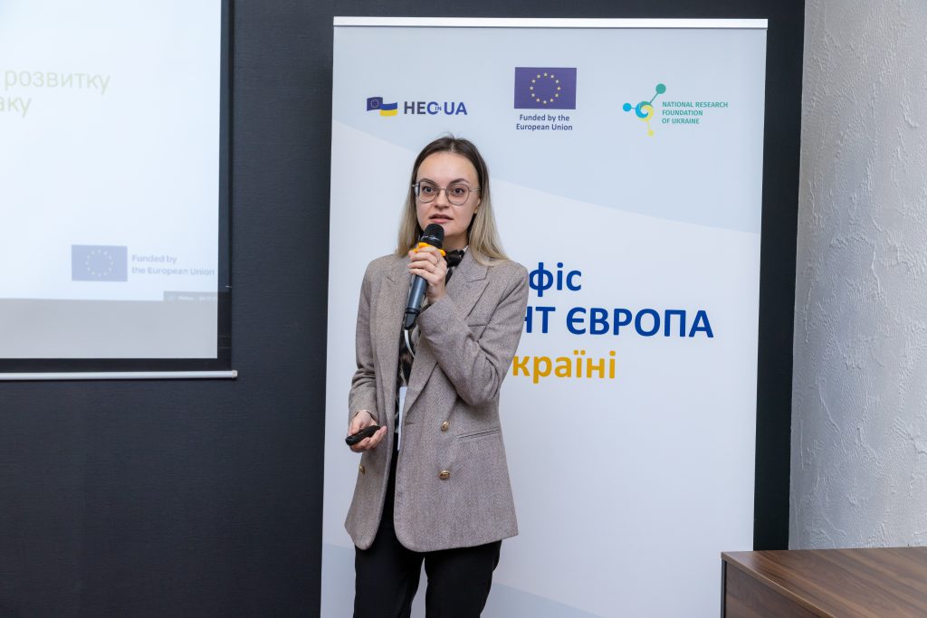 - інструменти підтримки в рамках конкурсів Європейської дослідницької ради: а саме, про схеми фінансування, останні нововведення і додаткові програми підтримки у рамках ERC інформувала Джанка Матрай, спеціалістка з питань науки Виконавчої агенції Європейської дослідницької ради.