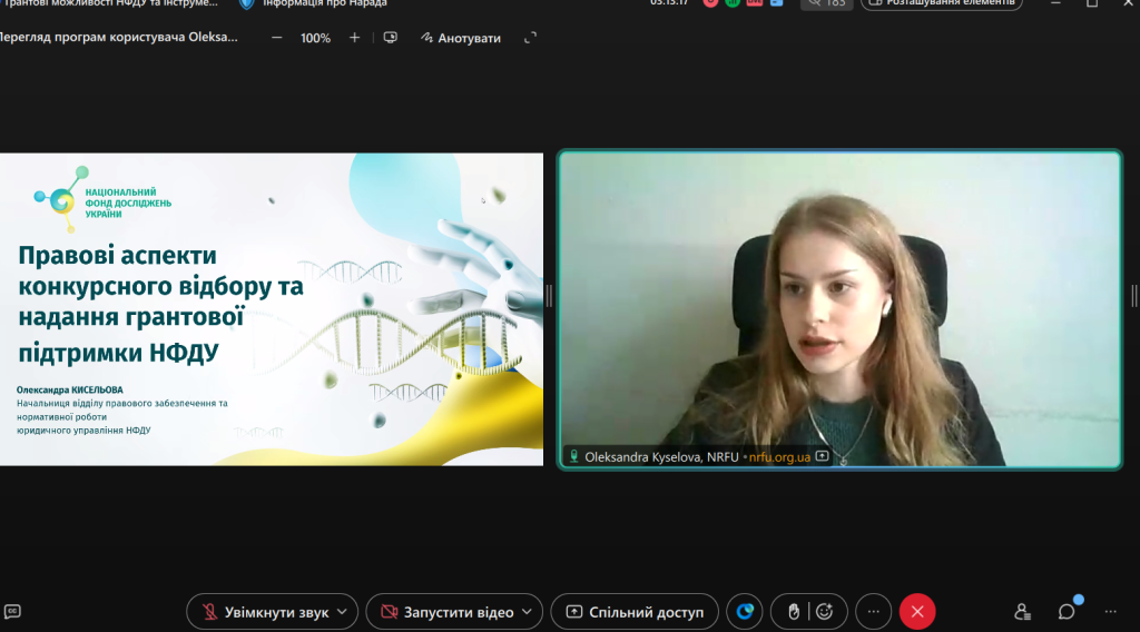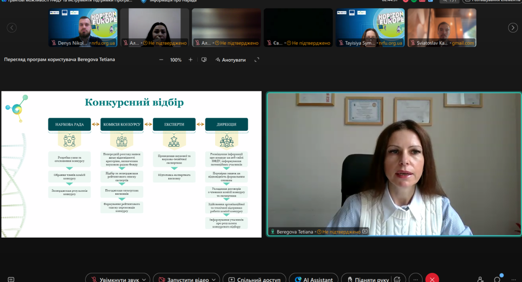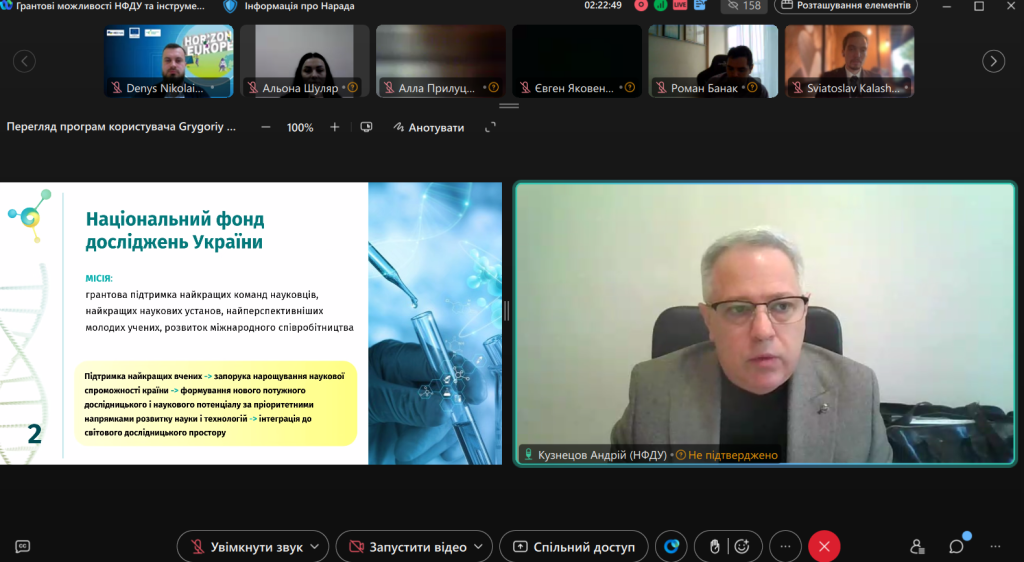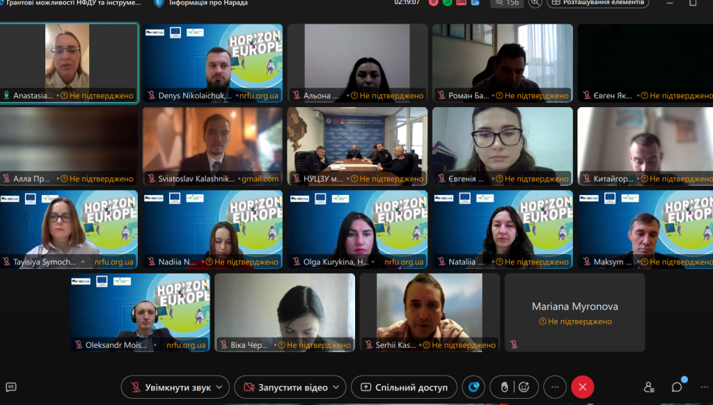 Під час вебінару учасники отримали детальну інформацію про можливості фінансування досліджень молодих учених у межах конкурсів НФДУ та Рамкової програми «Горизонт Європа».