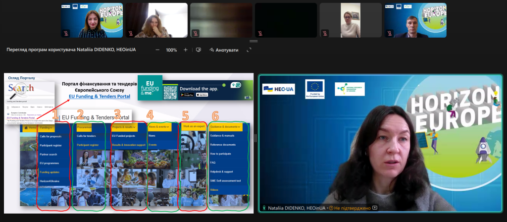 Друга частина вебінару була присвячена можливостям Рамкової програми ЄС з досліджень та інновацій «Горизонт Європа». Так, Наталія Діденко, заступниця начальника відділу «Офіс Горизонт Європа в Україні» НФДУ, розповіла про перші кроки на шляху до участі у Програмі та можливості використання Funding & Tenders Portal. Крім того, Максим Колісник, головний спеціаліст відділу, представив актуальні конкурси Програми для молодих дослідників.