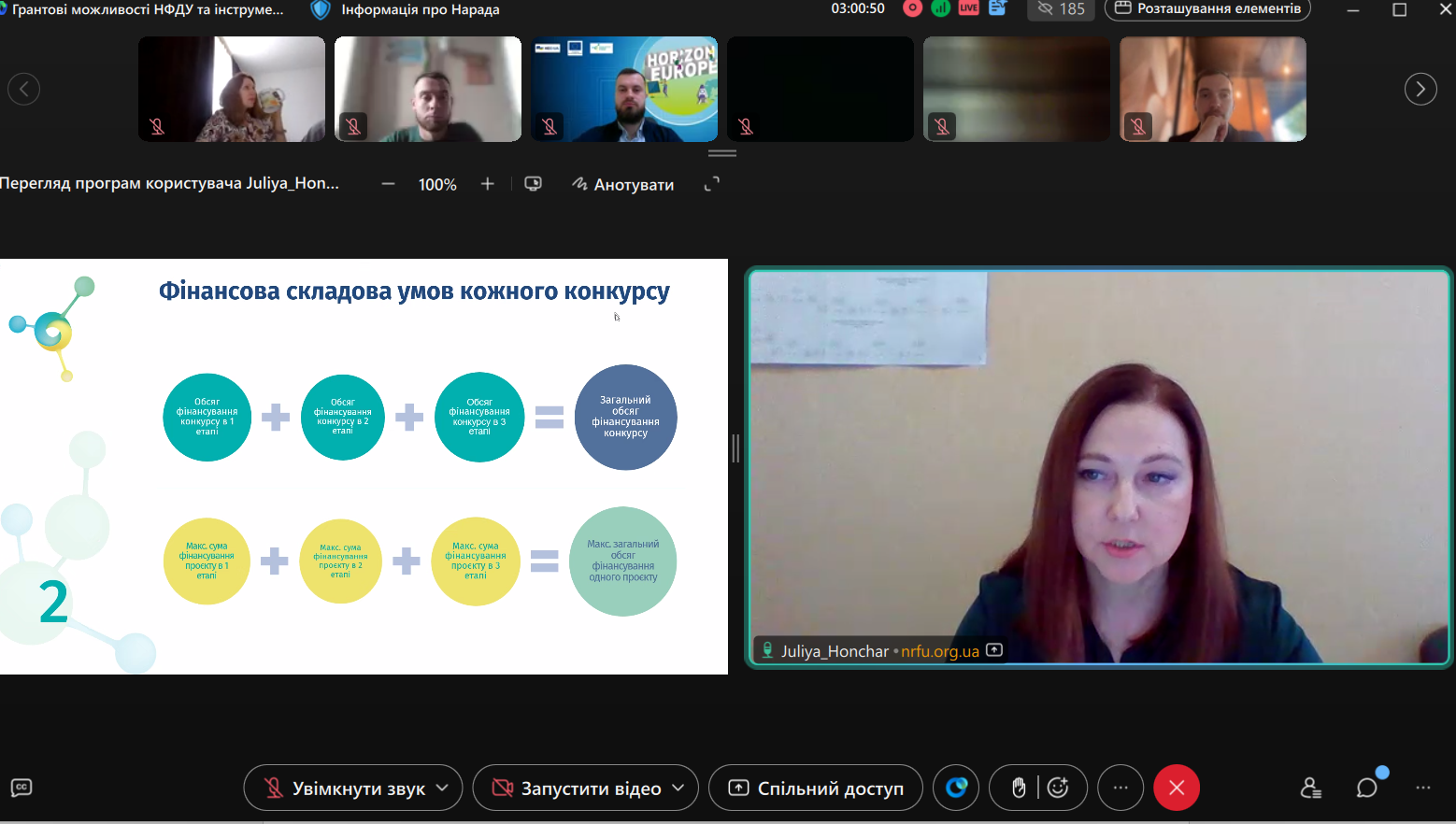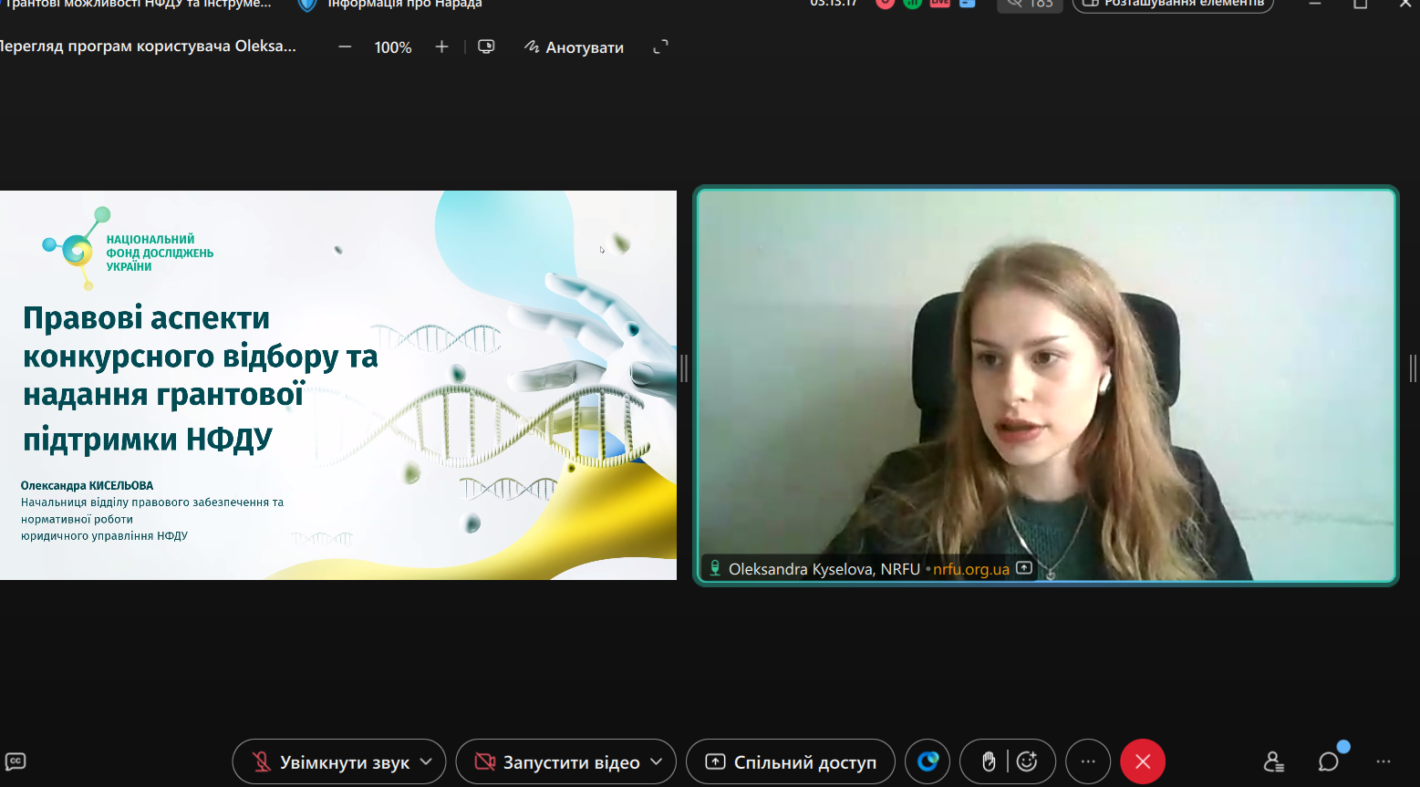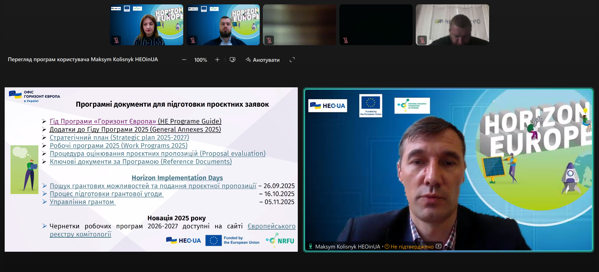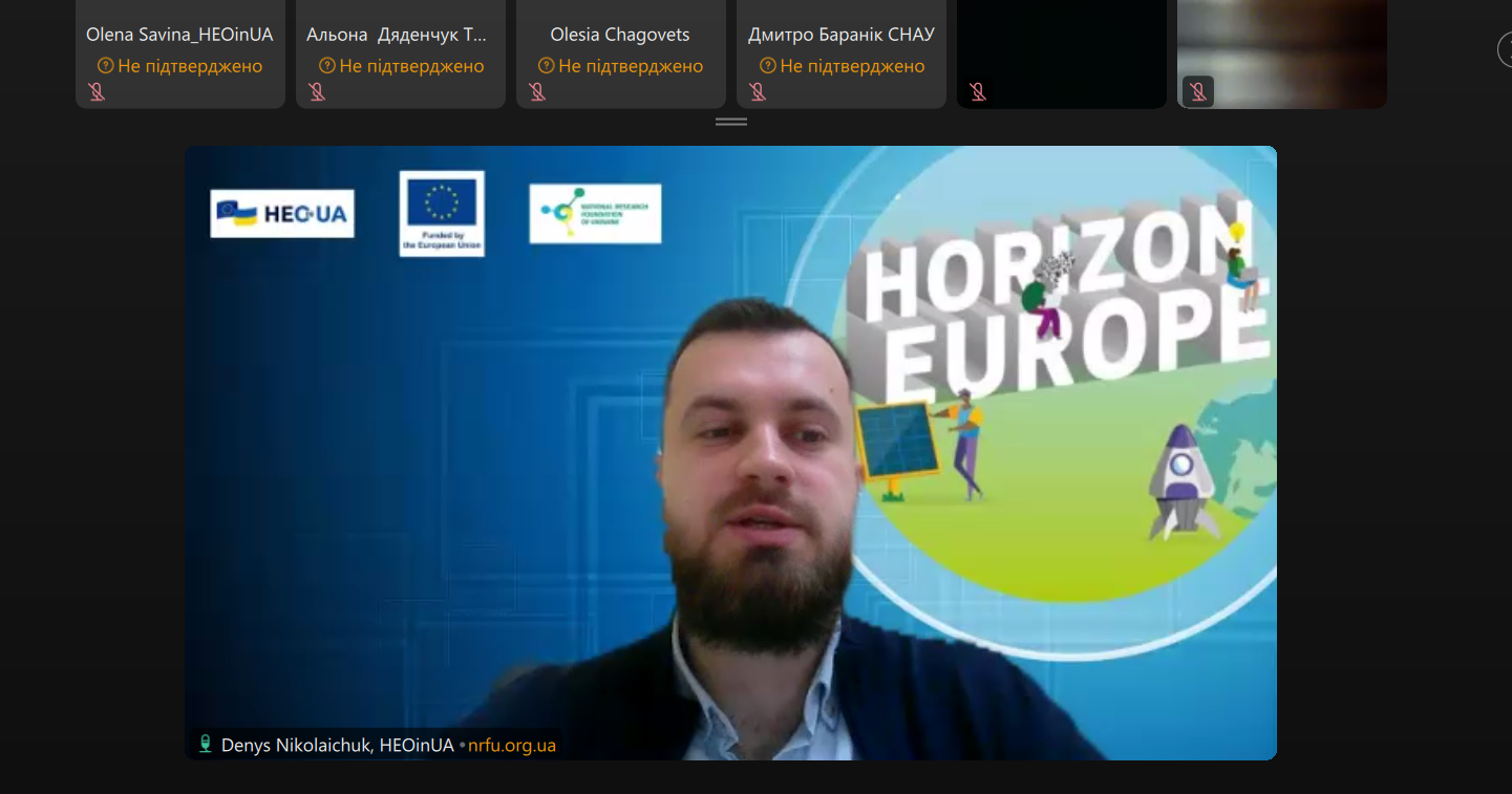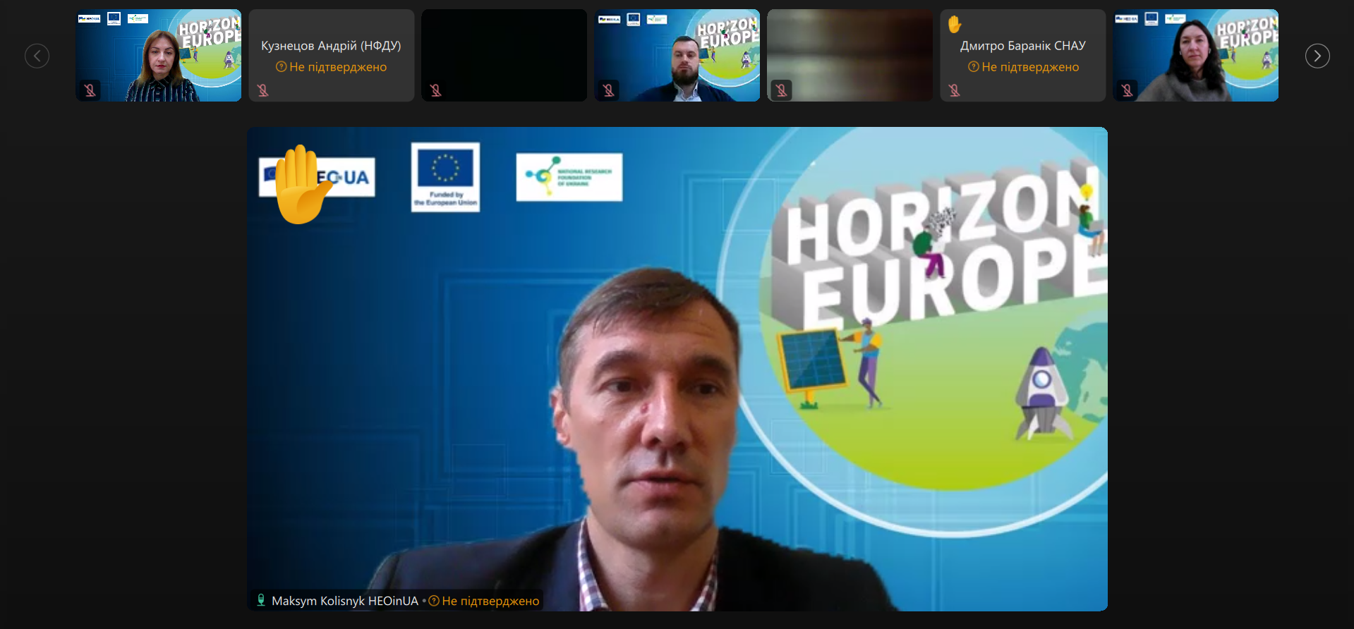 Під час вебінару учасники отримали детальну інформацію про можливості фінансування досліджень молодих учених у межах конкурсів НФДУ та Рамкової програми «Горизонт Європа».