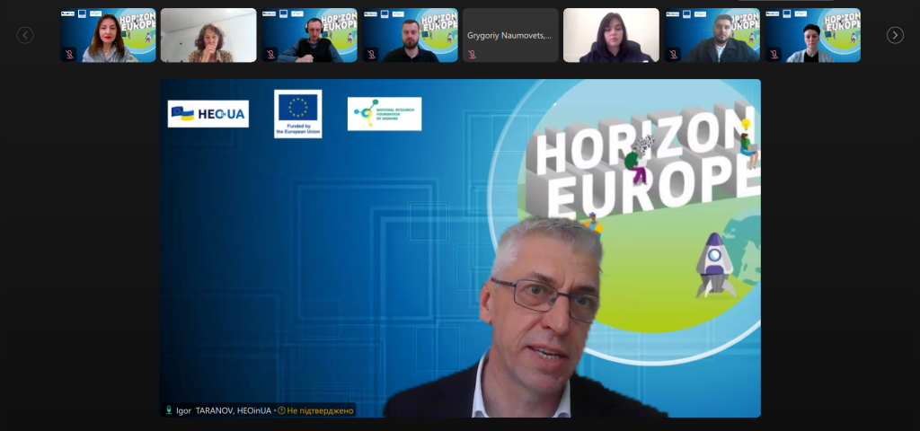 Зустріч розпочав начальник відділу «Офіс Горизонт Європа в Україні» НФДУ Ігор Таранов, який познайомив із його працівниками та представив результати роботи Офісу. Керівник відділу звернув увагу на вплив діяльності Офісу на відбудову національної системи досліджень та інновацій завдяки участі України у Програмі «Горизонт Європа».