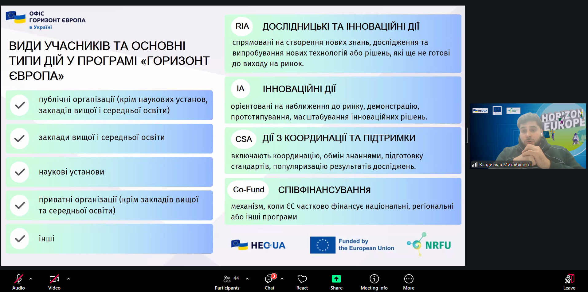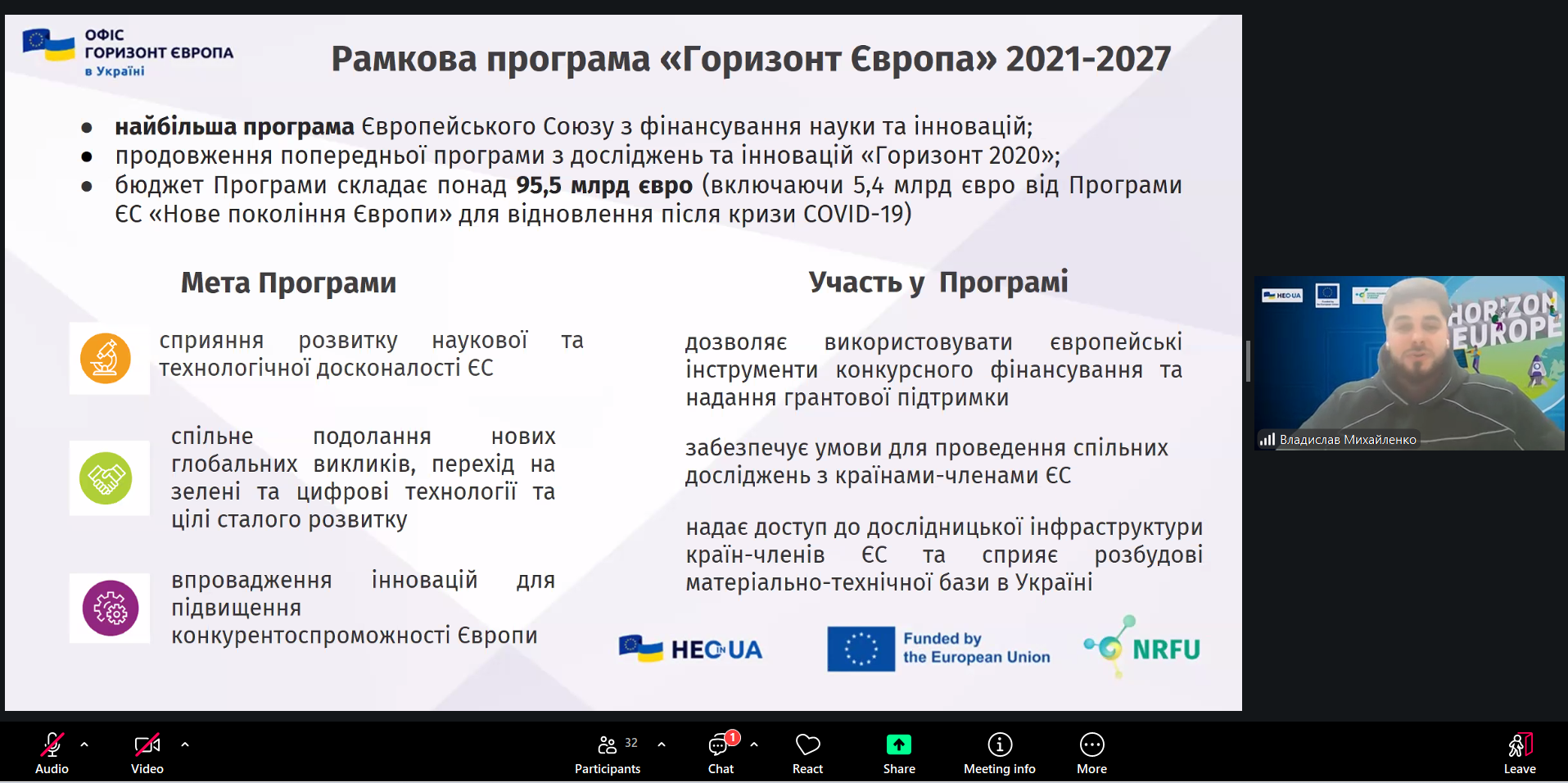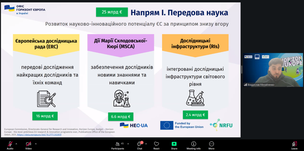 Окрему увагу було приділено можливостям участі українських організацій і дослідників у конкурсах Програми, а також практичним порадам щодо підготовки конкурентоспроможних проєктних пропозицій. Наприкінці заходу Владислав Михайленко надав фахові відповіді на питання, що цікавили учасників.