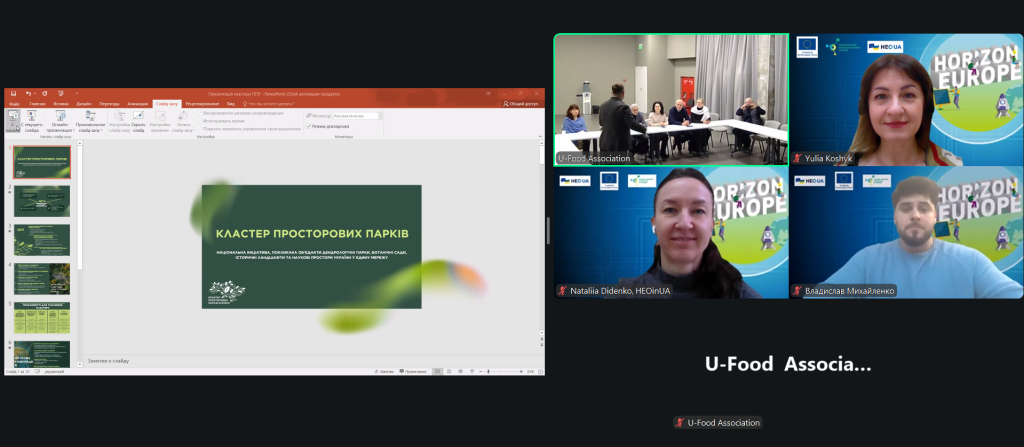 Фахівці «Офісу Горизонт Європа в Україні» НФДУ постійно долучаються до заходів, які проводять партнери, щоб якомога більше інформувати про актуальні можливості й останні новини Рамкової програми «Горизонт Європа». Так, 22 грудня відбулася зустріч «Презентація Кластера просторових парків України: спільний розвиток та плани на 2026 рік», у межах якої було представлено концепцію Кластера просторових парків України як інструменту координації, партнерства та спільного розвитку.