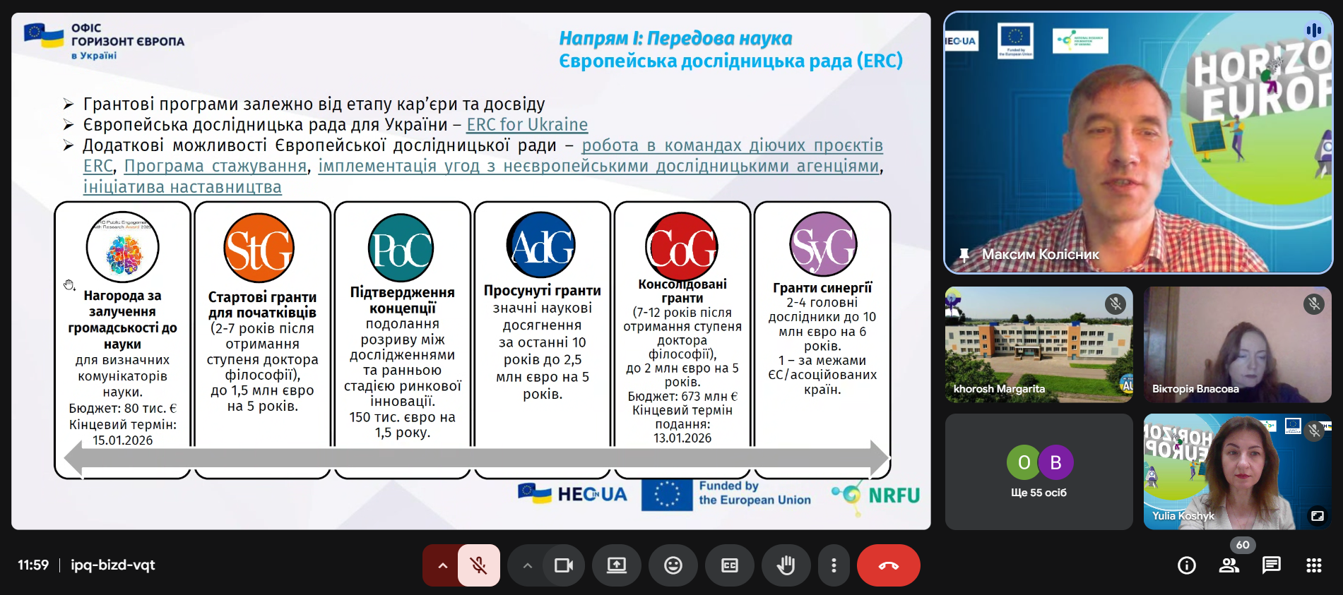 Зі свого боку головний спеціаліст Офісу Максим Колісник докладно розповів про можливості Програми для бізнесу, серед яких інструменти участі, вибір типів проєктів та фінансування, пошук партнерів для створення консорціумів. Фахівець детально описав відкриті конкурси Програми, дотичні до бізнесу. Він також наголосив на важливості синергії науки і бізнесу, надавши інформацію про можливості у цьому розрізі. Зокрема, станом на 22 грудня 2025 року доступно 567 конкурсів: 106 відкрито та 461 буде відкрито на порталі фінансування і тендерів Європейського Союзу.