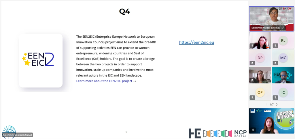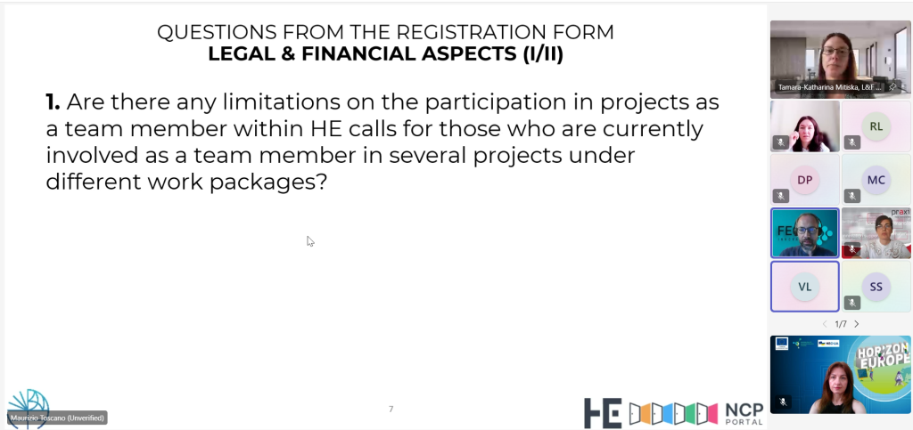 Під час першої сесії представниці НКП Васілікі Калодіму, спеціалістка з наскрізного компонента Програми «Розширення участі та зміцнення європейського дослідницького простору» (WIDERA), Греція, та Тамара-Катаріна Мітіска, яка відповідає за фінансові та юридичні аспекти, Австрія, презентували свою діяльність. Також спікерки відповідали на різноманітні питання щодо функціонування Програми «Горизонт Європа» від учасників, що були надіслані заздалегідь чи виникали безпосередньо під час трансляції заходу.