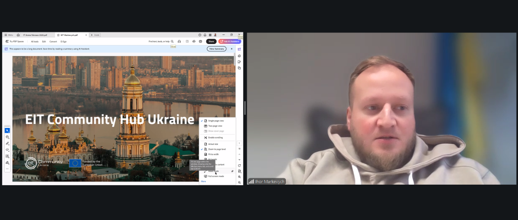 Начальник відділу «Офіс Горизонт Європа в Україні» НФДУ Ігор Таранов виступив із вітальною промовою, в якій зазначив збільшення українських учасників у РП «Горизонт Європа» порівняно з РП «Горизонт 2020». Крім того, він наголосив на важливості синергії в роботі Офісу, НКП «Європейський інститут інновацій і технологій» та EIT Community Hub in Ukraine для всебічного охоплення всіх охочих долучитися до Програми за компонентом «Європейський інститут інновацій і технологій» і поглиблення знань потенційних заявників. Окремо Ігор Таранов відзначив діяльність керівниці НКП «Європейський інститут інновацій і технологій» Віталіни Бабенко, яка є надзвичайно активною у своїй діяльності.