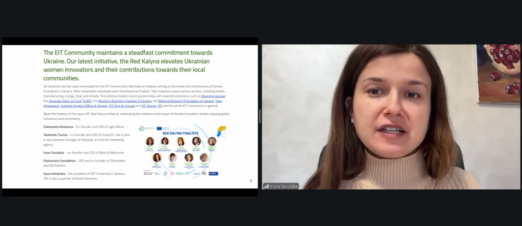 Серед спікерів виступили керівниця НКП «Європейський інститут інновацій і технологій» Віталіна Бабенко, керівник EIT Community Hub in Ukraine Ігор Маркевич, а також Ірина Савіцька, що є керівницею компанії Bank of Memories – переможниці конкурсу ЕІТ Red Kalyna.