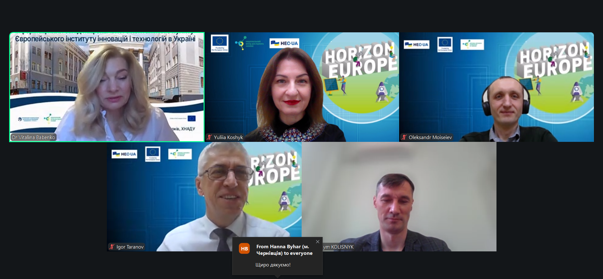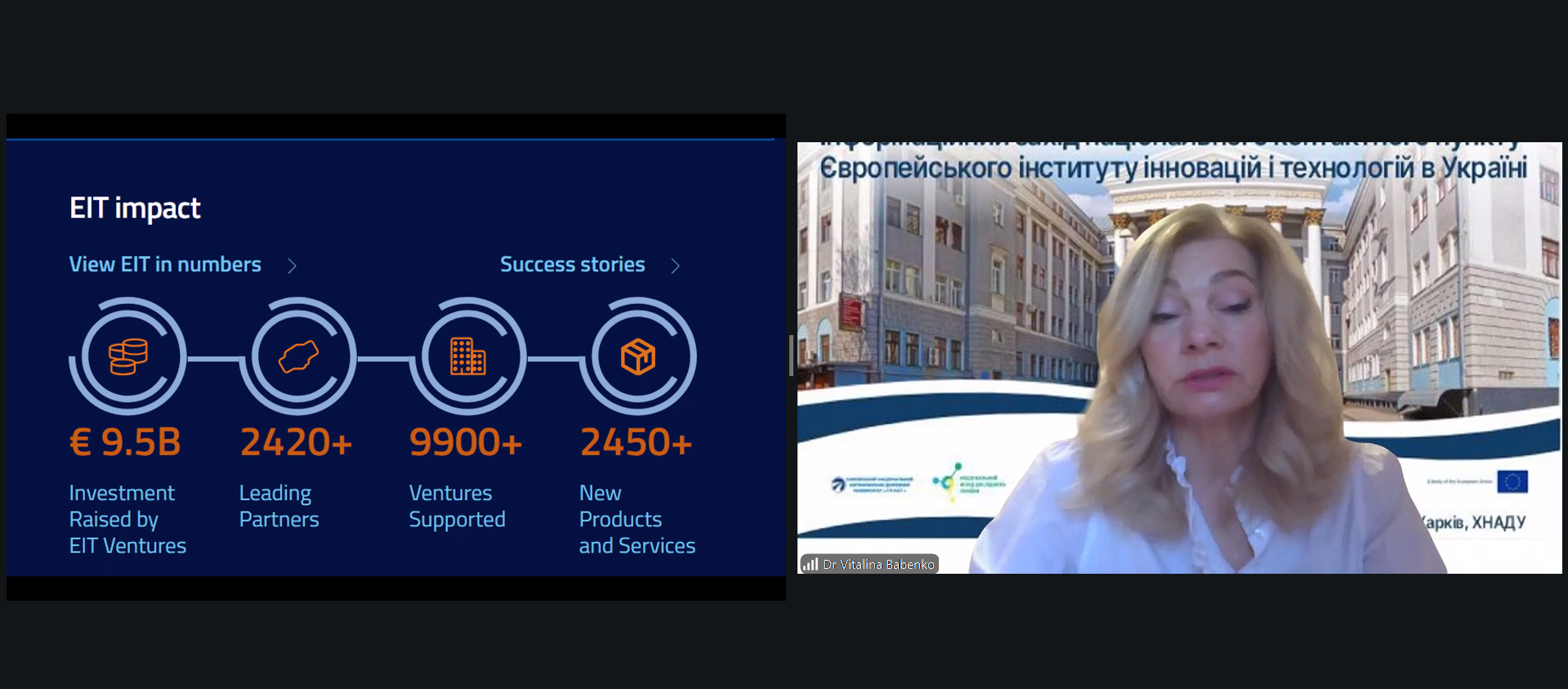 Начальник відділу «Офіс Горизонт Європа в Україні» НФДУ Ігор Таранов виступив із вітальною промовою, в якій зазначив збільшення українських учасників у РП «Горизонт Європа» порівняно з РП «Горизонт 2020». Крім того, він наголосив на важливості синергії в роботі Офісу, НКП «Європейський інститут інновацій і технологій» та EIT Community Hub in Ukraine для всебічного охоплення всіх охочих долучитися до Програми за компонентом «Європейський інститут інновацій і технологій» і поглиблення знань потенційних заявників. Окремо Ігор Таранов відзначив діяльність керівниці НКП «Європейський інститут інновацій і технологій» Віталіни Бабенко, яка є надзвичайно активною у своїй діяльності.