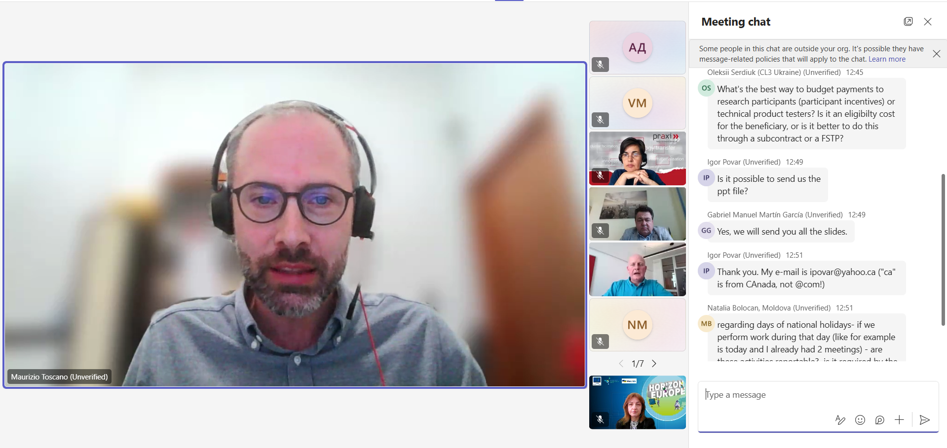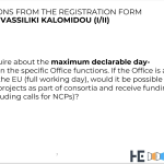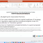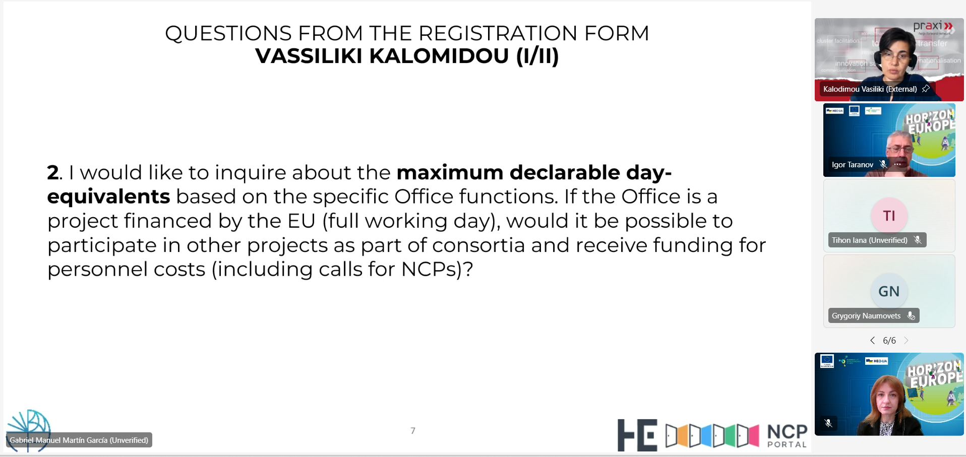 Протягом цієї сесії представники НКП Васілікі Калодіму, спеціалістка з наскрізного компонента Програми WIDERA, Греція, та Мартін Баумґартнер, який відповідає за фінансові та юридичні аспекти, Австрія, надавали роз’яснення на заздалегідь надіслані учасниками питання, а також які виникали безпосередньо під час трансляції заходу, в межах своїх напрямів відповідальності. Зокрема, питання стосувалися можливостей участі НКП як партнера проєктів, попереднього оцінювання проєктних заявок, максимальної кількості днів зайнятості у проєктах, бюджетування, субконтрактингу та інших фінансових питань.