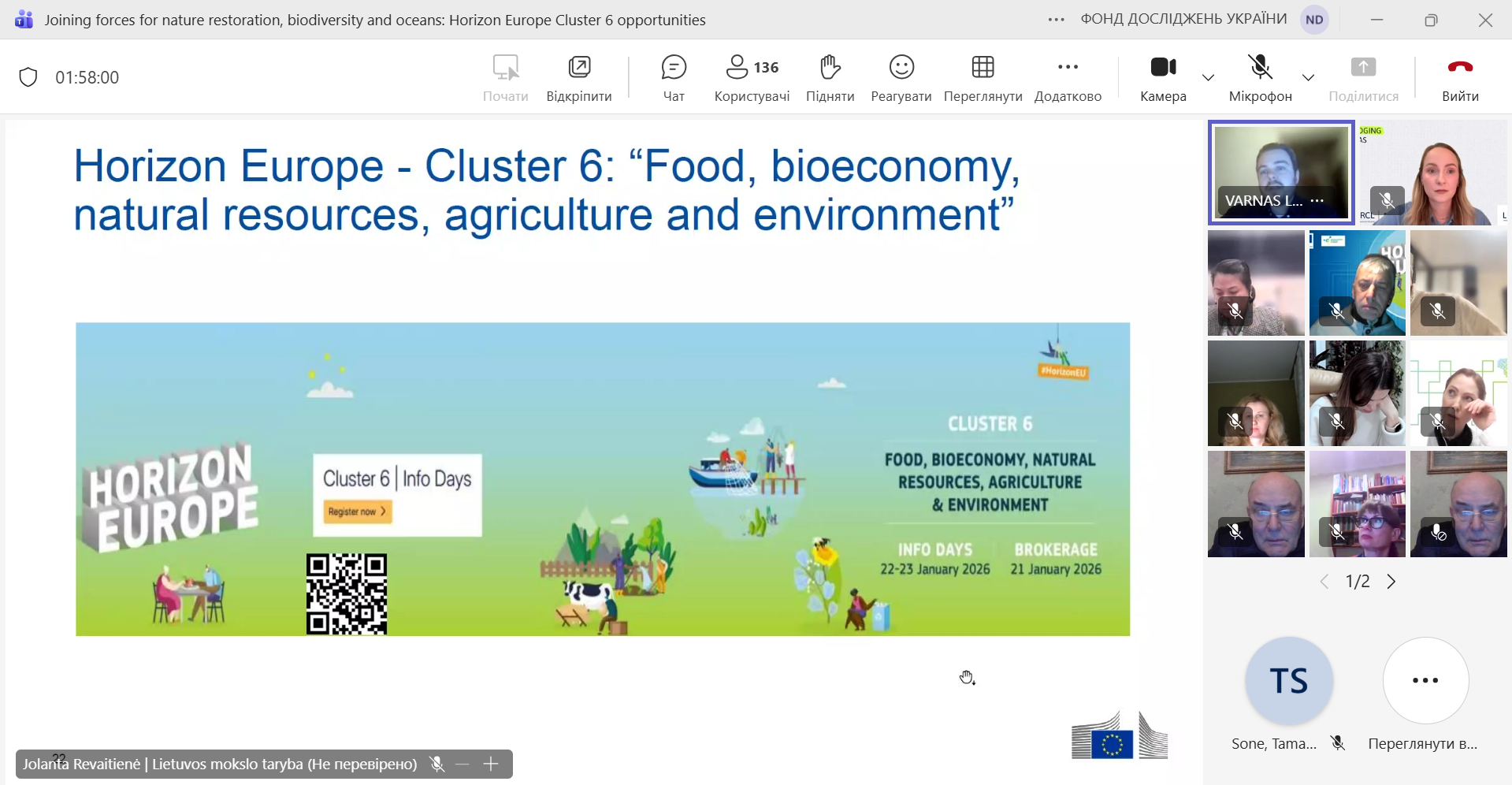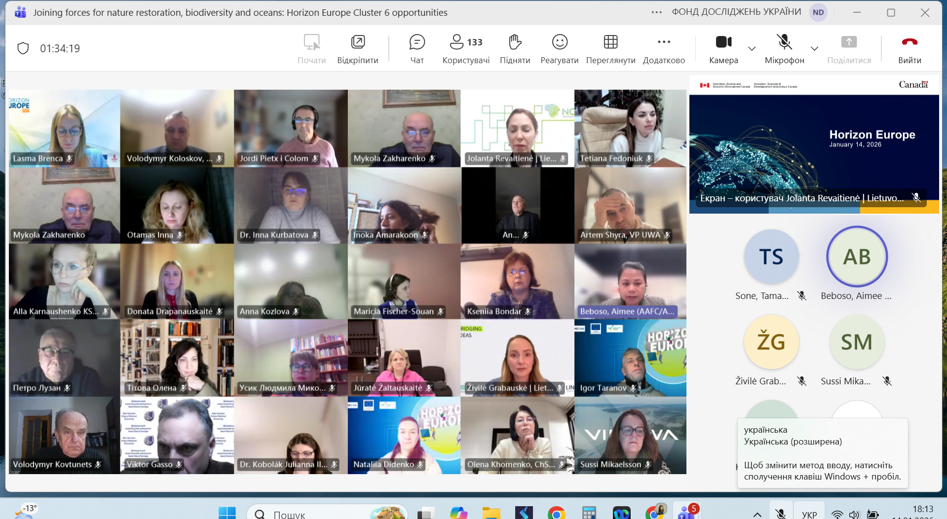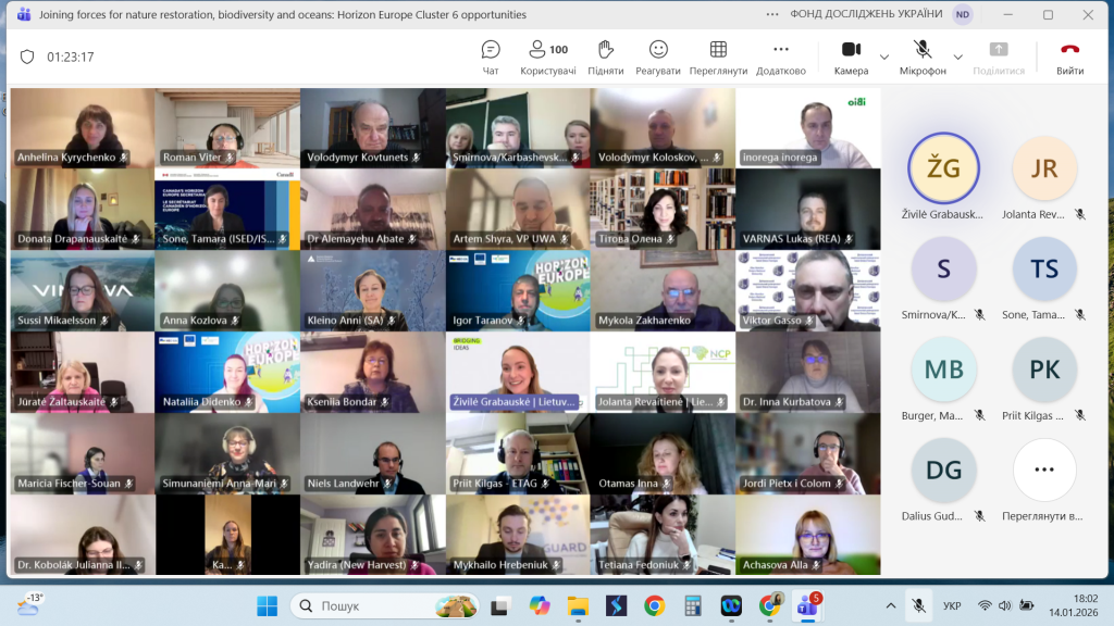 14 січня 2026 року відбувся онлайн-захід «Об’єднуємо зусилля заради відновлення природних ресурсів, біорізноманіття та океанів: можливості від Програми «Горизонт Європа» за кластером 6», спрямований на пошук партнерів у межах майбутніх конкурсів за кластером 6 «Продовольство, біоекономіка, природні ресурси, сільське господарство і навколишнє середовище» на 2026 рік. Представники відділу «Офіс Горизонт Європа в Україні» НФДУ, зокрема начальник відділу Ігор Таранов та заступниця начальника відділу Наталія Діденко, долучилися до події.