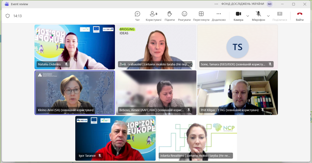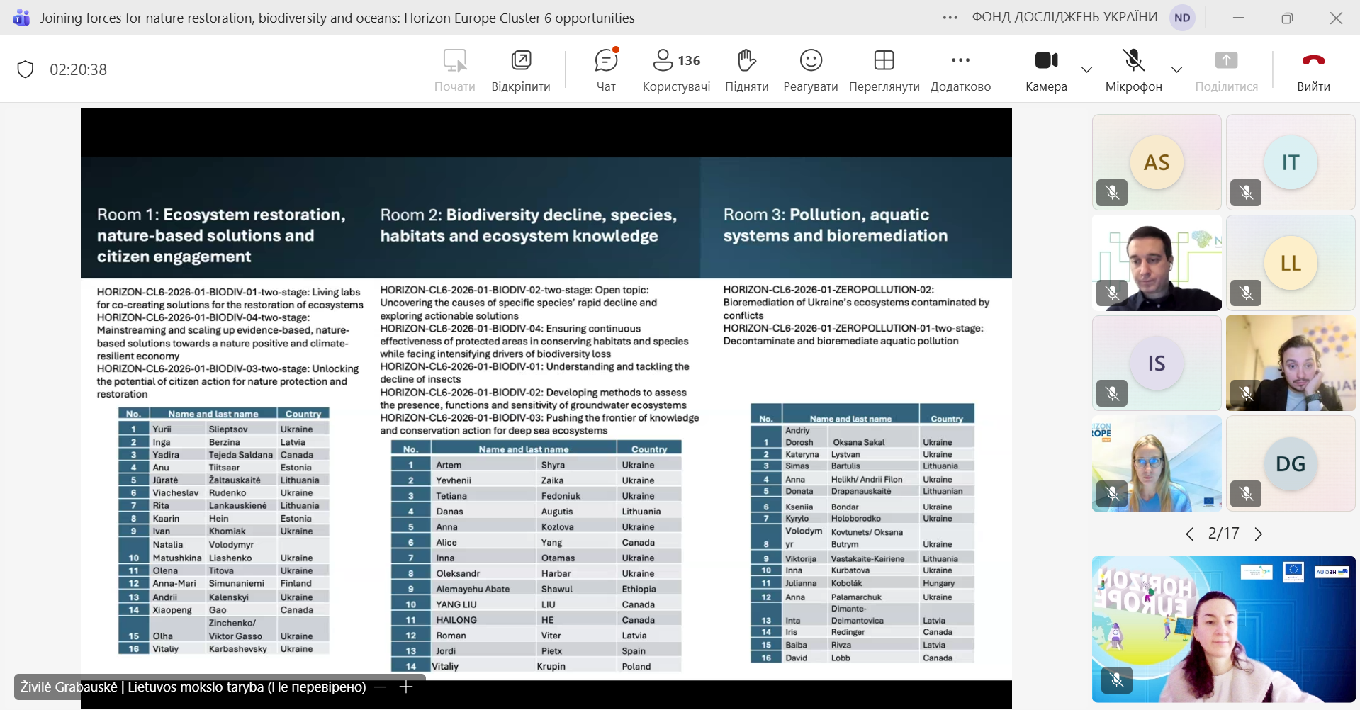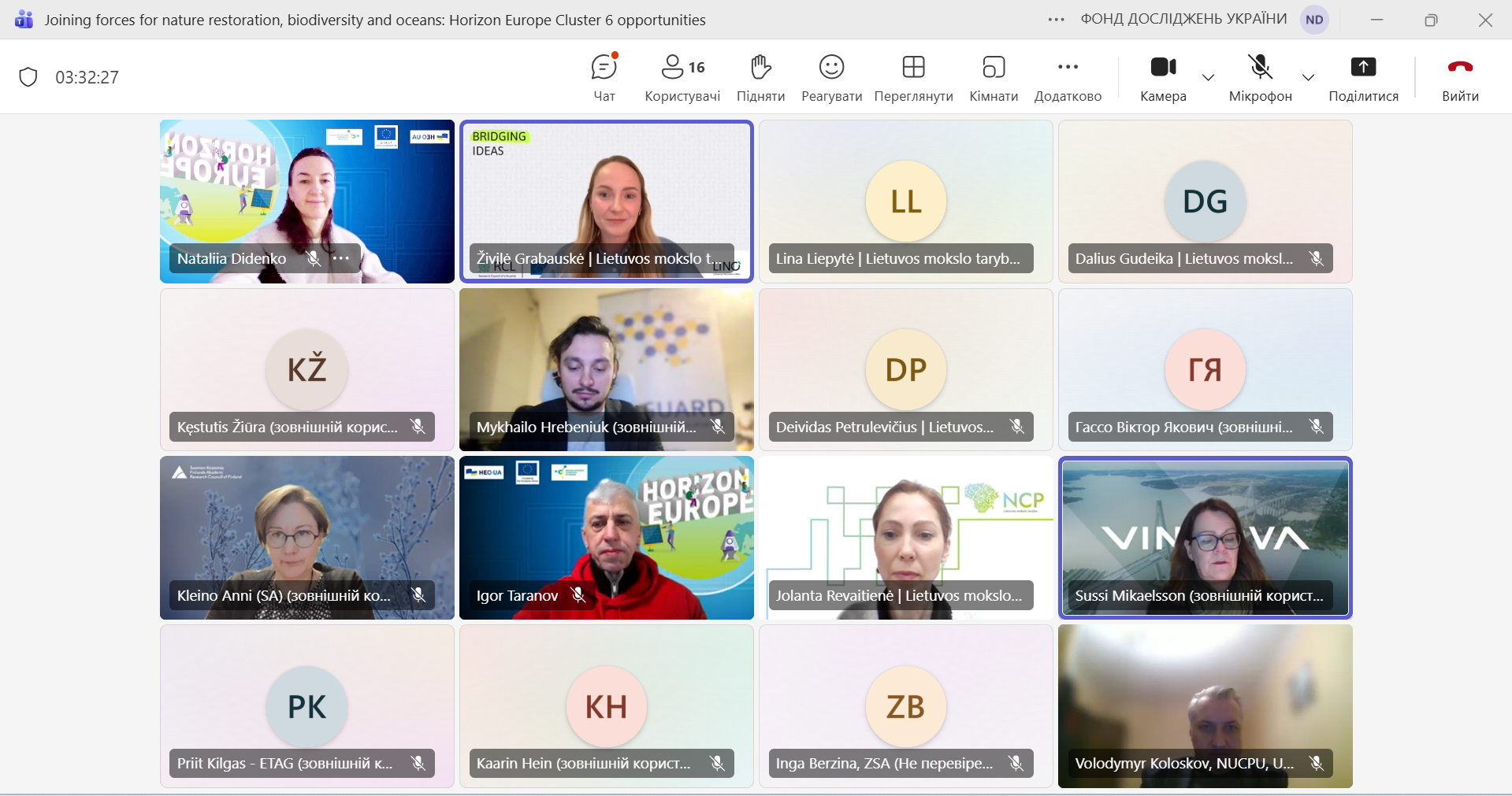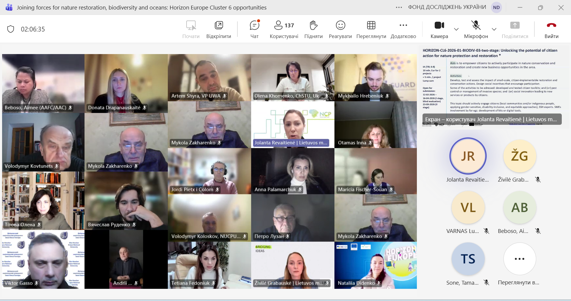 14 січня 2026 року відбувся онлайн-захід «Об’єднуємо зусилля заради відновлення природних ресурсів, біорізноманіття та океанів: можливості від Програми «Горизонт Європа» за кластером 6», спрямований на пошук партнерів у межах майбутніх конкурсів за кластером 6 «Продовольство, біоекономіка, природні ресурси, сільське господарство і навколишнє середовище» на 2026 рік. Представники відділу «Офіс Горизонт Європа в Україні» НФДУ, зокрема начальник відділу Ігор Таранов та заступниця начальника відділу Наталія Діденко, долучилися до події.