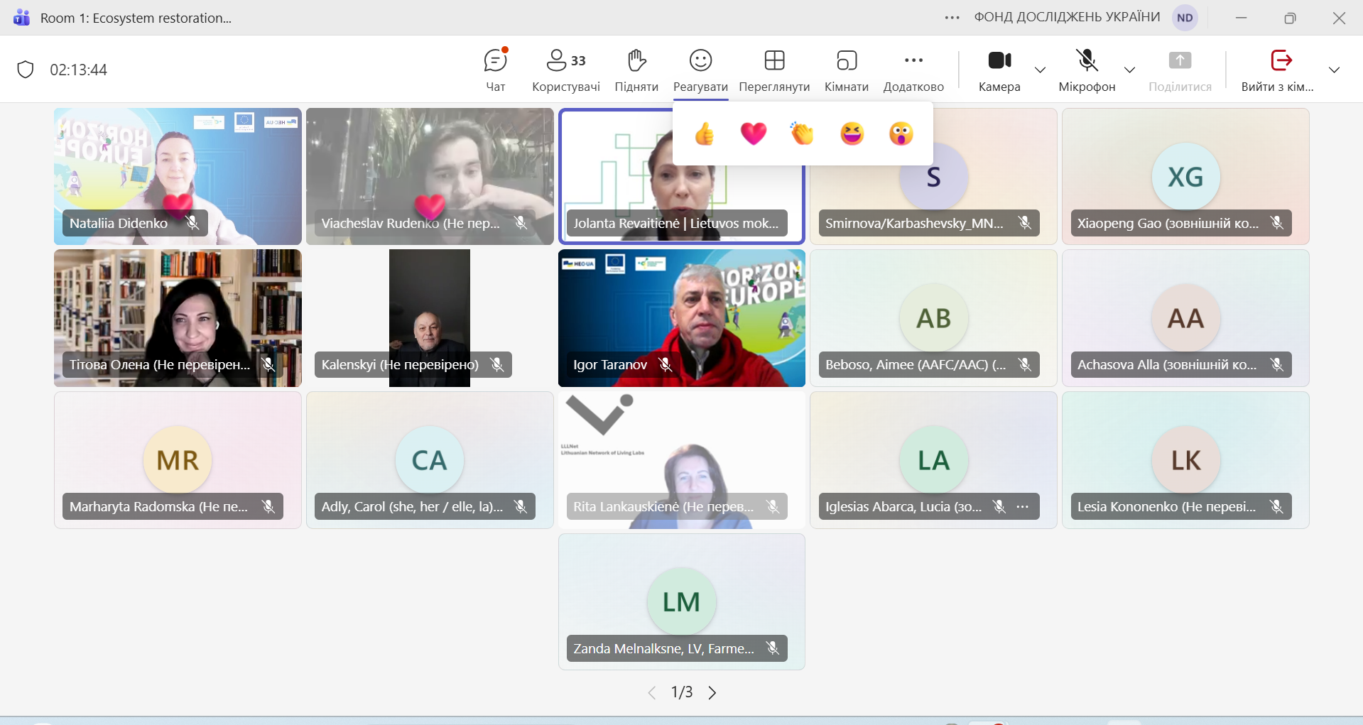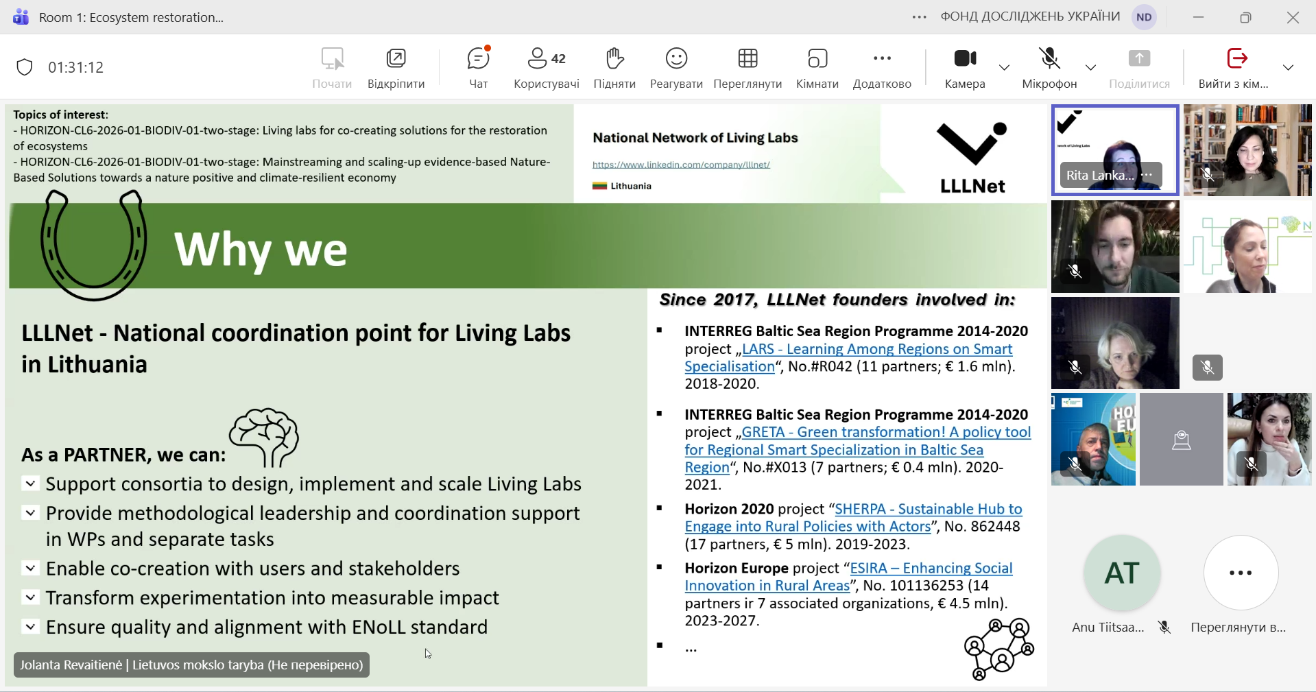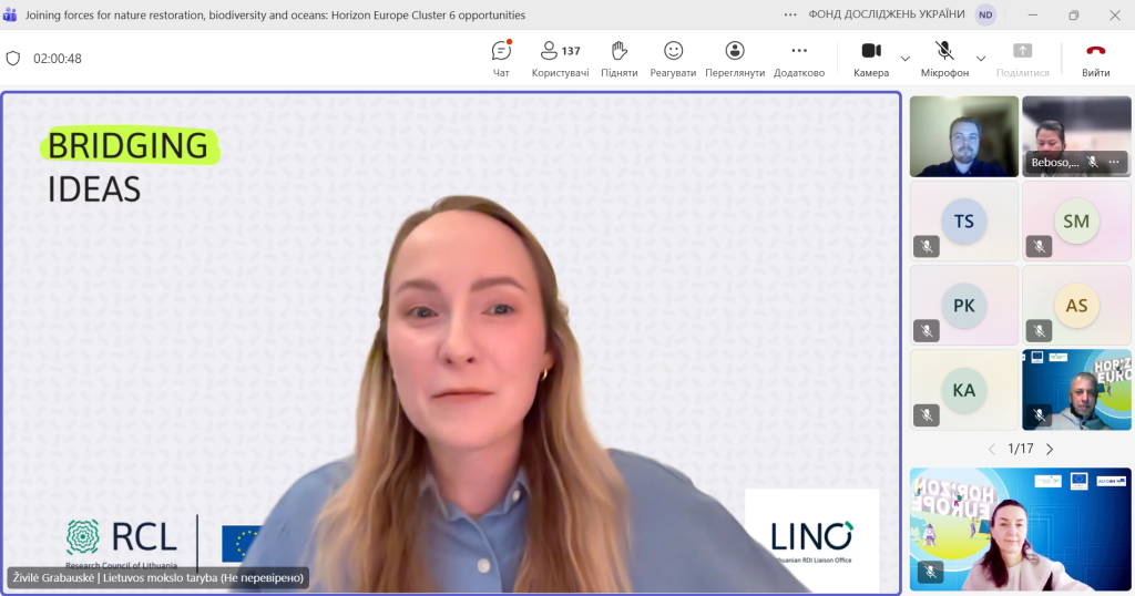 Представник ЄК Лукас Варнас (Lukas Varnas), REA B3 – Біорізноманіття, циркулярна економіка та довкілля, акцентував увагу на процесі оцінювання проєктних пропозицій та як сформувати успішну заявку. Йоланта Ревайтенє (Jolanta Revaitienė), представниця НКП Дослідницької ради Литви з питань продовольства, біоекономіки, природних ресурсів, сільського господарства та навколишнього середовища Програми «Горизонт Європа» довела до відома учасникам інформацію щодо деталей конкурсів, вибраних для обговорення та пошуку партнерів.