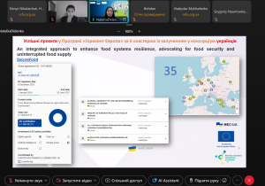 Заступниця керівника «Офісу Горизонт Європа в Україні» Наталія Діденко ознайомила учасників із особливостями функціонування Офісу та його ключовими напрямами роботи. Також було надано інформацію про можливості Програми «Горизонт Європа» в розрізі кластера 6 «Продовольство, біоекономіка, природні ресурси, сільське господарство і навколишнє середовище».