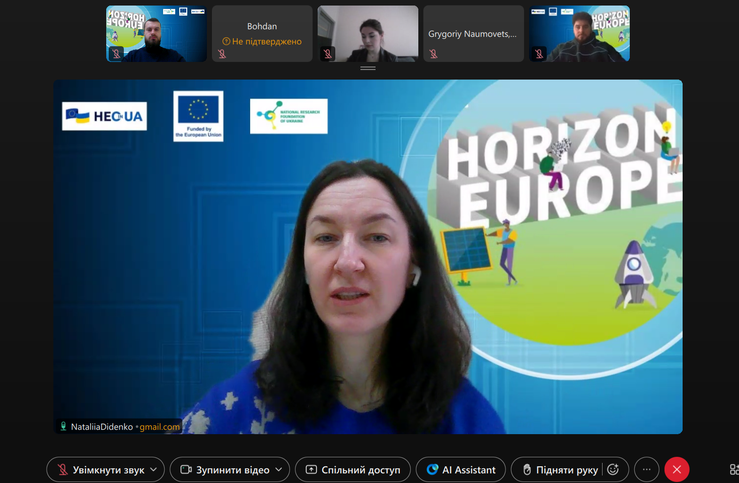 Заступниця керівника «Офісу Горизонт Європа в Україні» Наталія Діденко ознайомила учасників із особливостями функціонування Офісу та його ключовими напрямами роботи. Також було надано інформацію про можливості Програми «Горизонт Європа» в розрізі кластера 6 «Продовольство, біоекономіка, природні ресурси, сільське господарство і навколишнє середовище».