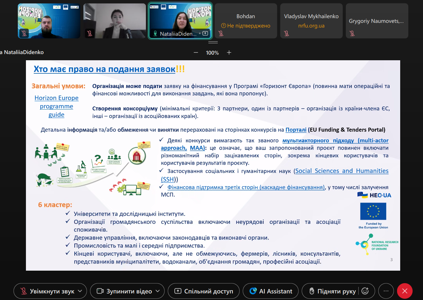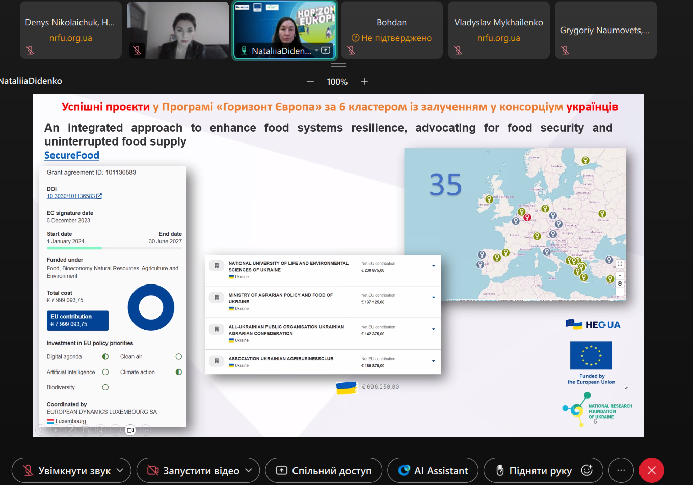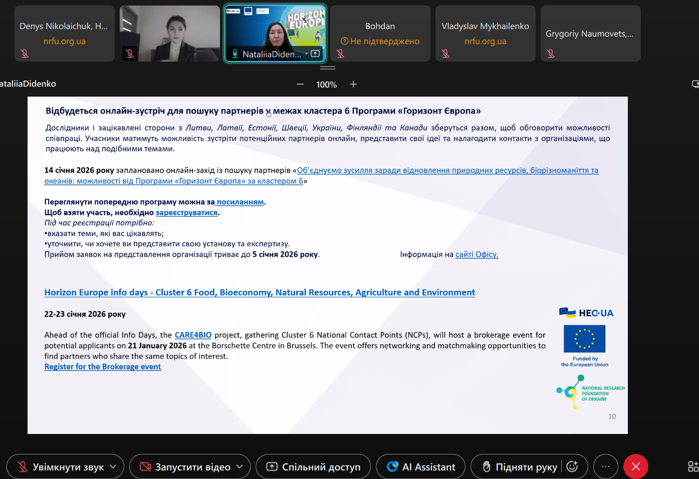 26 грудня 2025 року фахівці Офісу «Горизонт Європа в Україні» НФДУ провели онлайн-консультацію для представників Асоціації U-Food (Асоціація «Українська Харчова Асоціація»). Зустріч розпочалася з представлення сторін та продовжилася обговоренням питань, що становили інтерес для запитувачів.