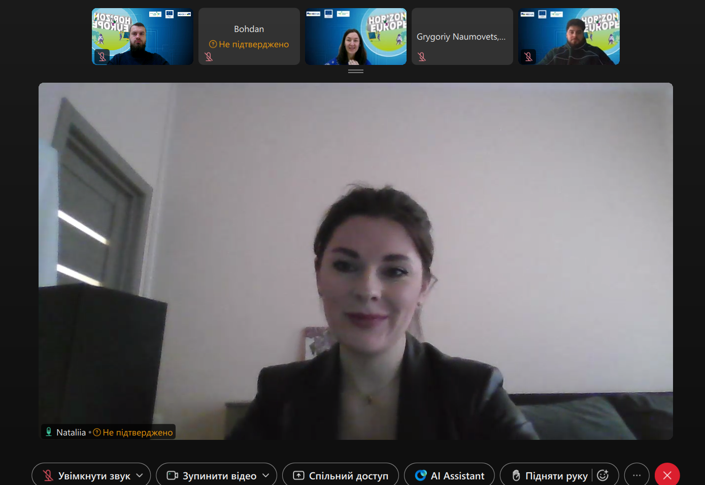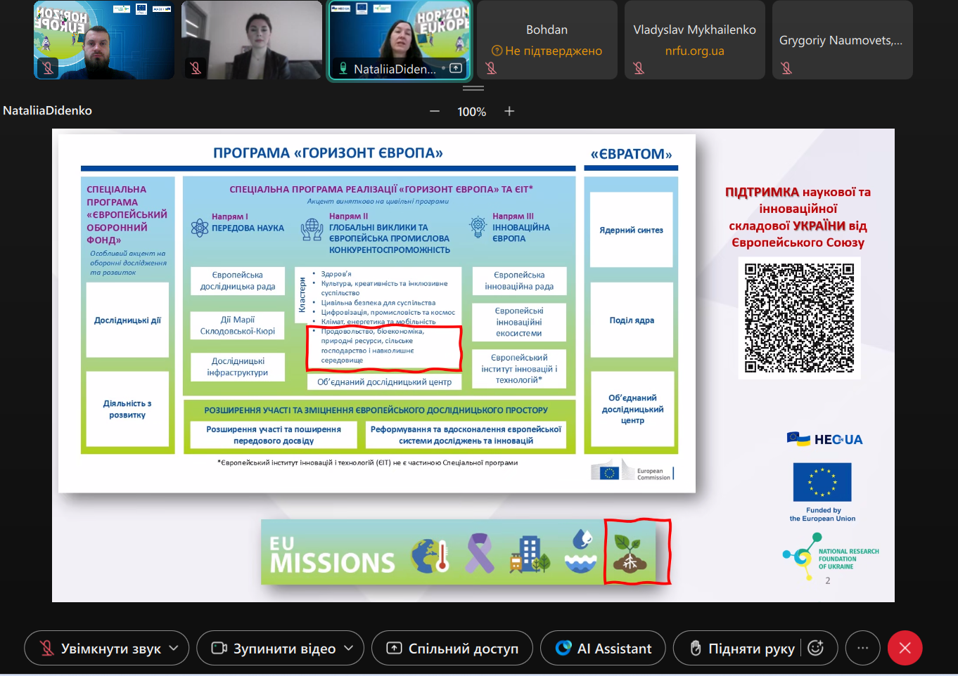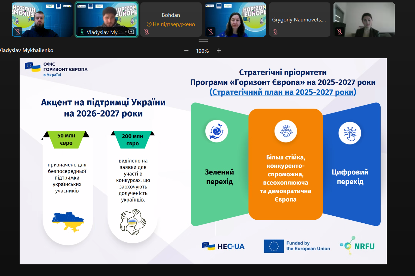 26 грудня 2025 року фахівці Офісу «Горизонт Європа в Україні» НФДУ провели онлайн-консультацію для представників Асоціації U-Food (Асоціація «Українська Харчова Асоціація»). Зустріч розпочалася з представлення сторін та продовжилася обговоренням питань, що становили інтерес для запитувачів.