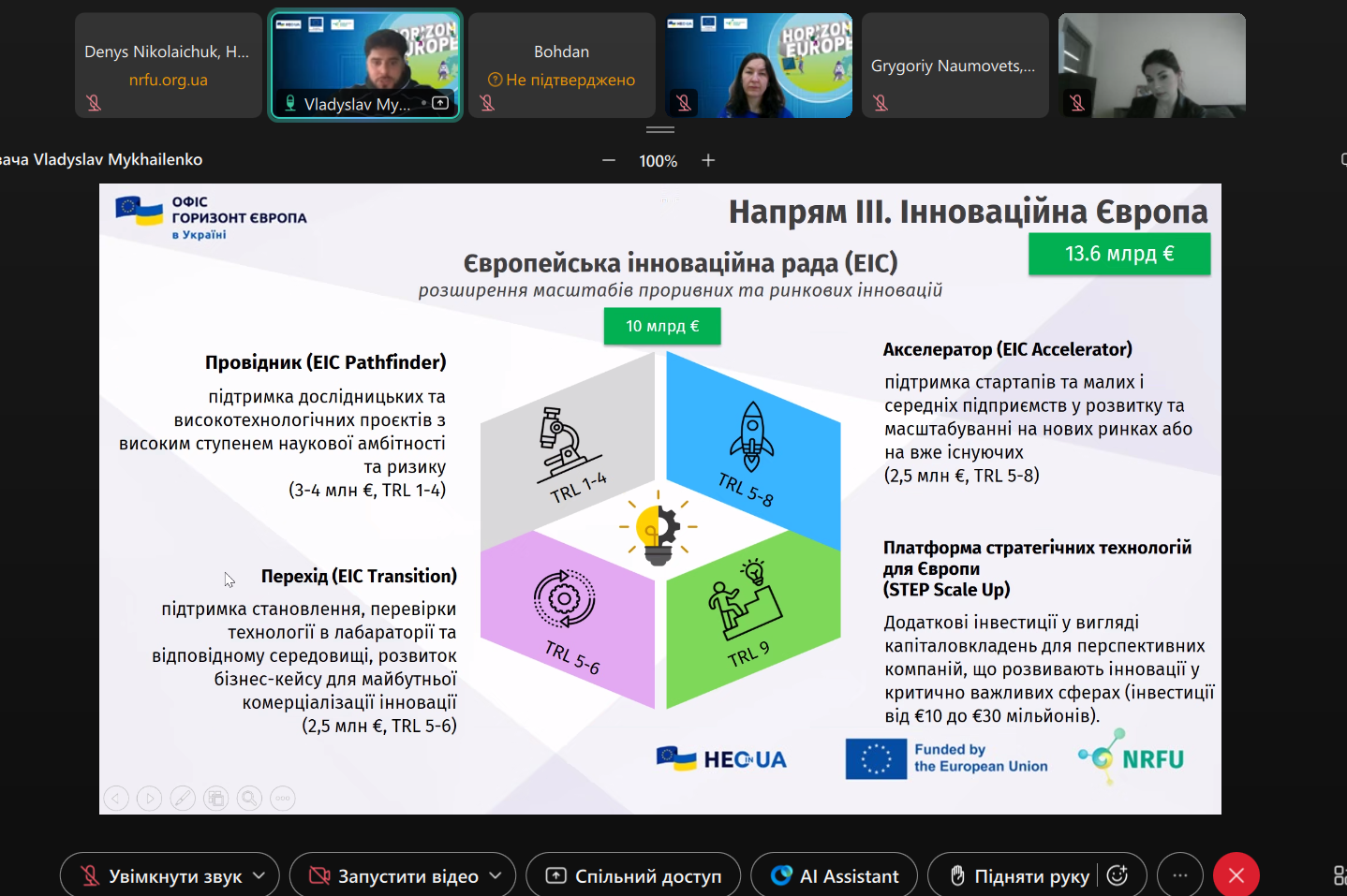 Головний спеціаліст Офісу Владислав Михайленко представив грантові можливості Програми, акцентувавши увагу на підтримці проривних досліджень та інновацій, а також на практичних результатах проєктів, що сприяють позитивним змінам у суспільстві.