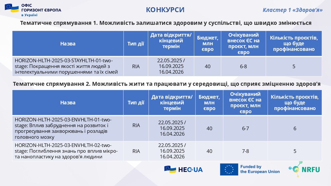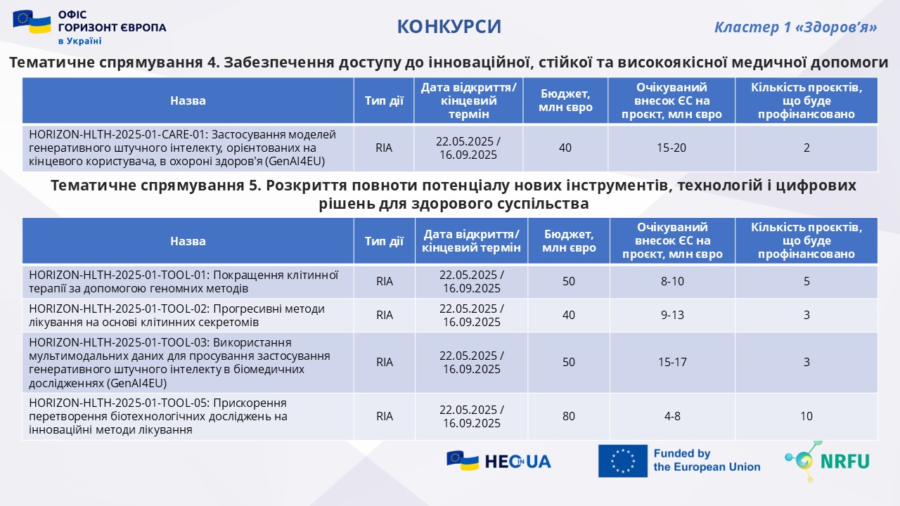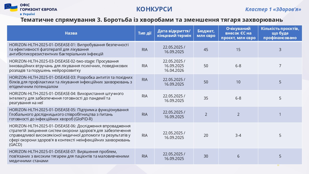 Відкриті конкурси за тематикою «Здоров’я» в Робочій програмі «Горизонт Європа» на 2025 рік