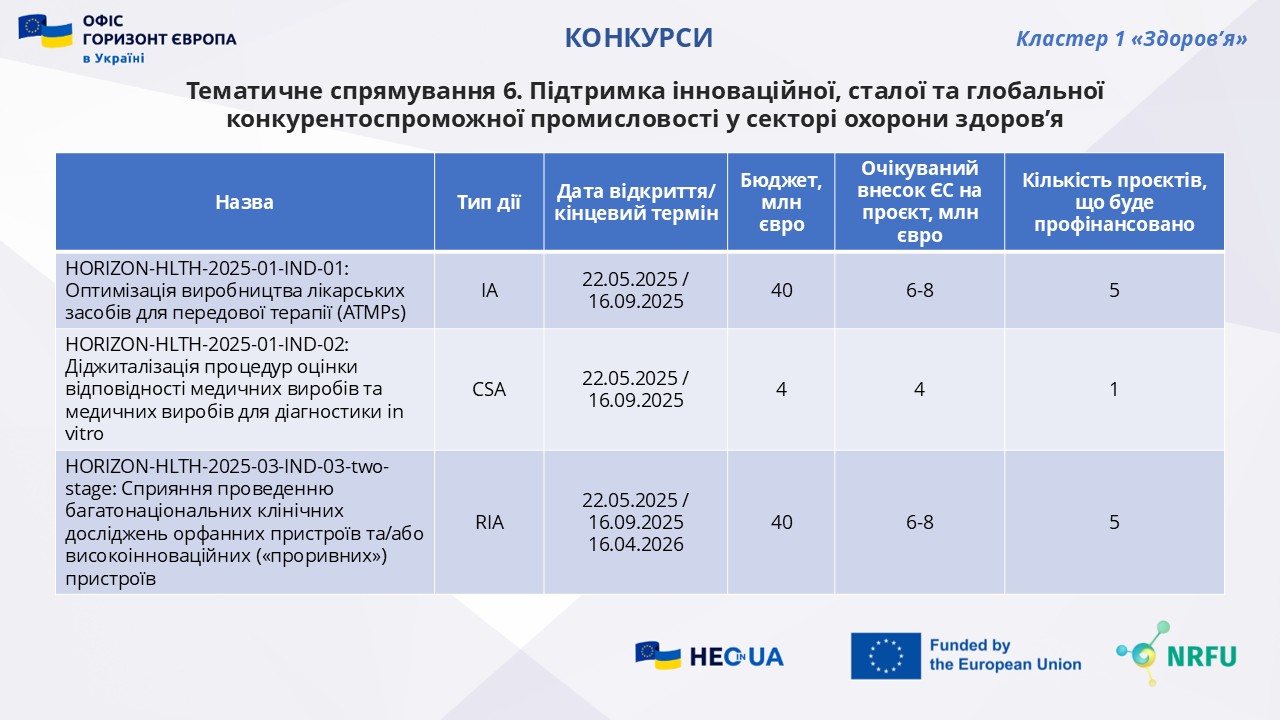 - Підтримка інноваційної, сталої та глобальної конкурентоспроможної промисловості у секторі охорони здоров’я / Maintaining an innovative, sustainable, and competitive EU health industry – 3 конкурси із загальним фінансуванням 84 млн євро.