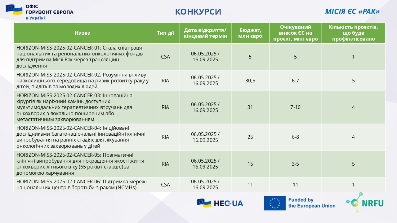 За Місією «Рак» відкрито 6 конкурсів із загальним обсягом фінансування 117,5 млн євро.