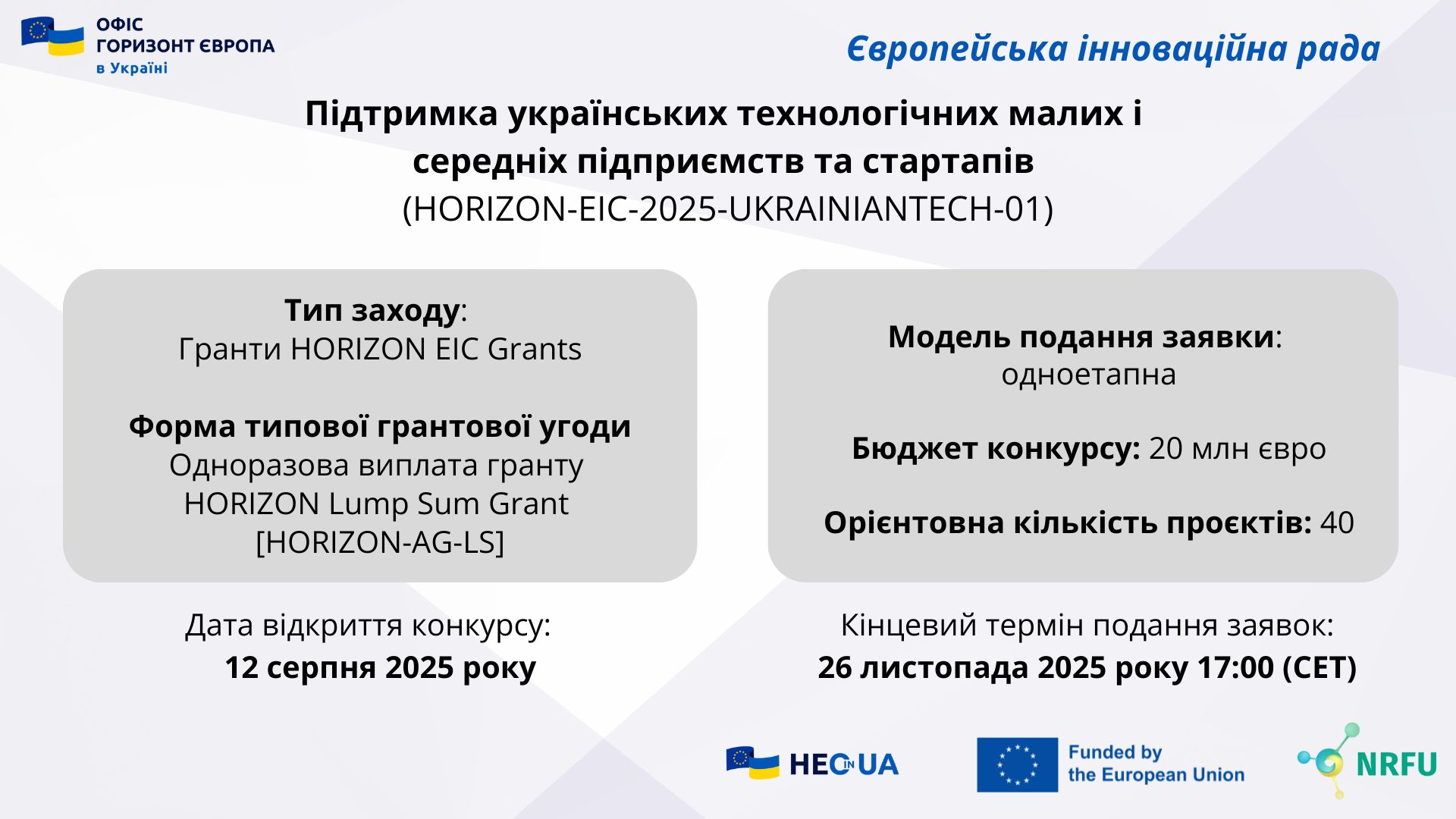 Відділ «Офіс Горизонт Європа в Україні» НФДУ інформує, що Європейська інноваційна рада (EIC) оголосила про запуск нового конкурсу для українських стартапів і малих та середніх підприємств у сфері високих технологій (Support for the Ukrainian tech SMEs and startups (HORIZON-EIC-2025-UKRAINIANTECH-01). На підтримку буде спрямовано 20 млн євро – ці кошти допоможуть пришвидшити розвиток проривних технологій в таких сферах, як штучний інтелект, робототехніка, біотехнології, кібербезпека тощо.
